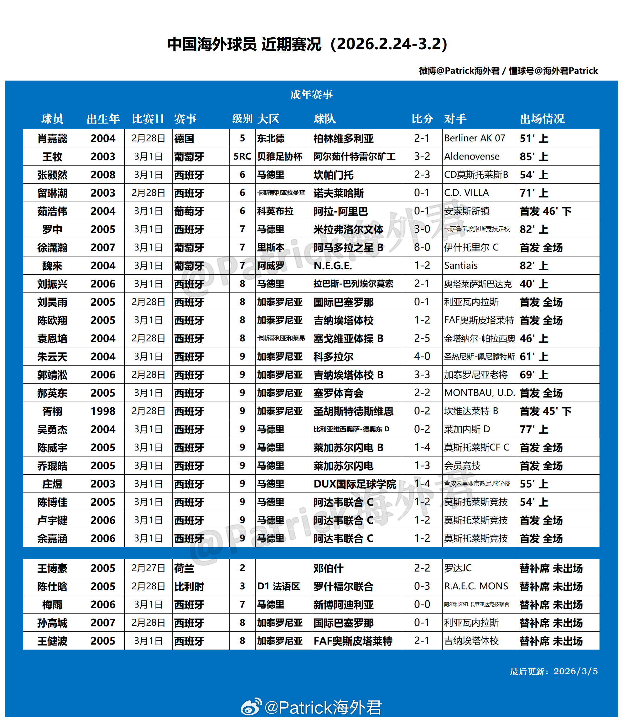 留洋周报 海外球员比赛一览 (2026年2月24日-3月2日)