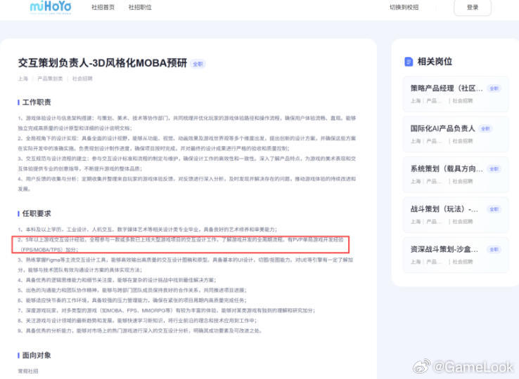 【米哈游「半二次元」战略全面启动,成功率几何?网页链接】近期,米哈游在招聘加分项中强调“PvP 单局游戏开发经验(FPS / MOBA / TPS 项目的开发经验)”、“有多人在线或协作玩法项目经验(PVE / PVP / Coop 等)”、“大型开放世界或竞技类游戏自动化经验者优先”……