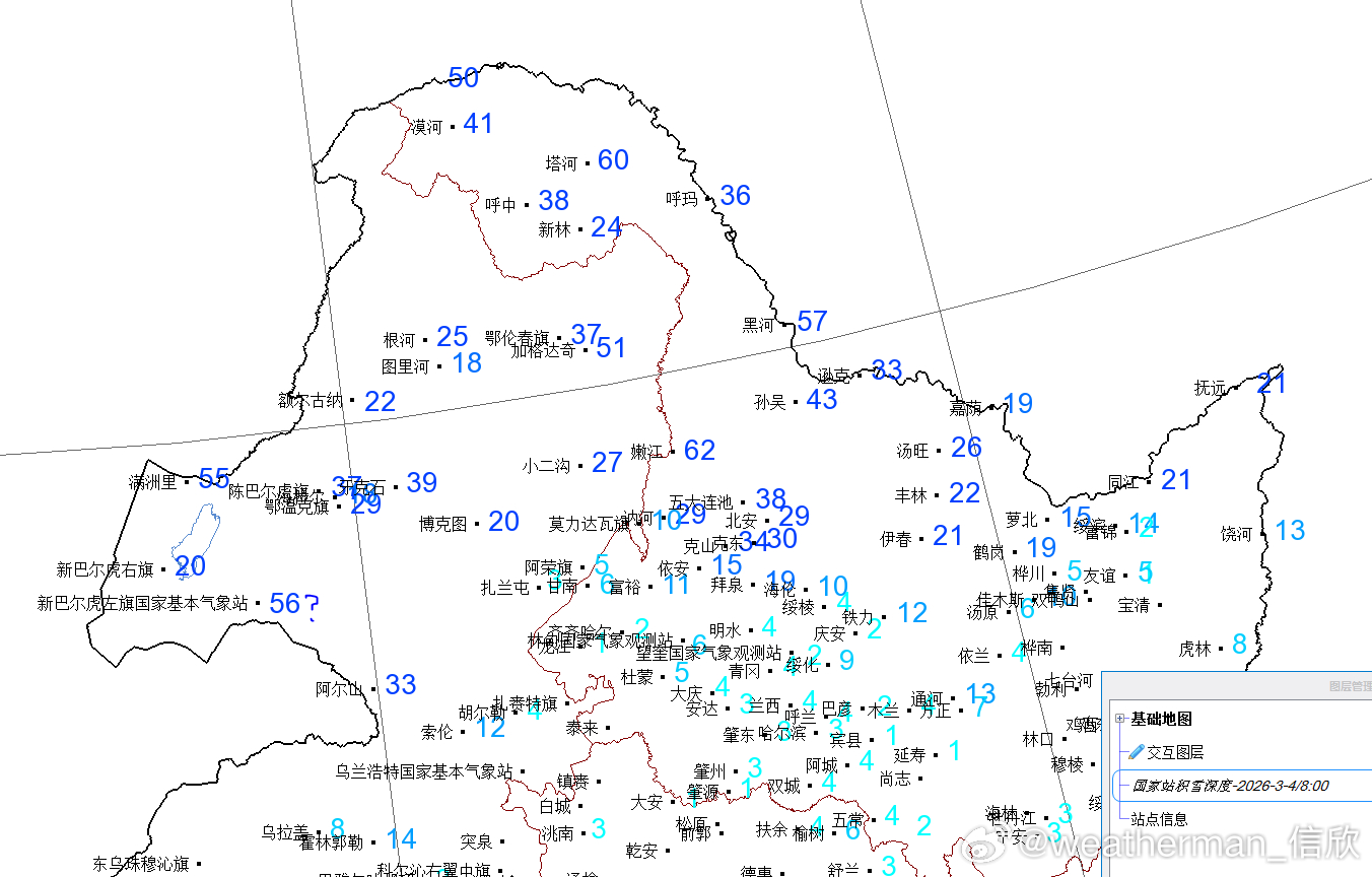 【雨雪——珠海破纪录】昨天到今晨,新疆北部、内蒙古东部、东北多地出现降雪。今晨8时积雪,内蒙古满洲里55厘米、黑龙江加格达奇51厘米、嫩江62厘米,打破当地观测史纪录。