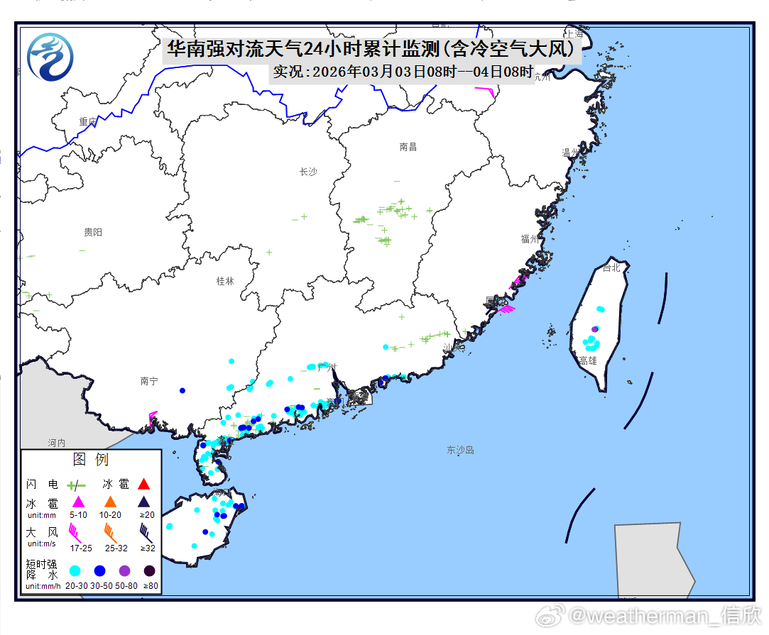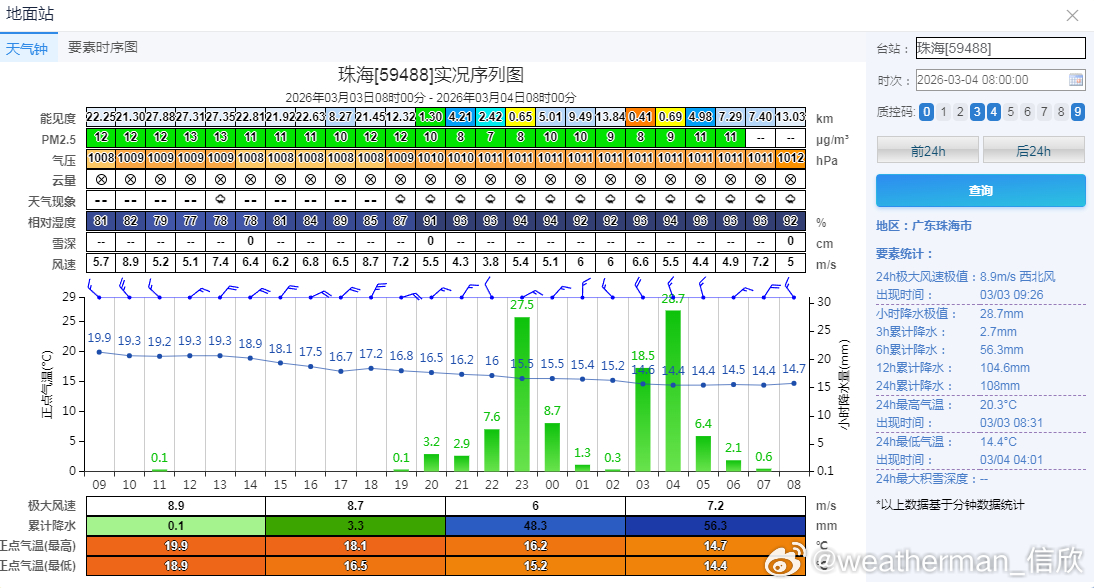 昨天到今晨,降雨主要在南方,华南部分地区出现短时强降雨,广东雨势最强,包揽了24小时降水榜前20。珠海108毫米,打破观测史最早大暴雨日纪录,3月单日降水量纪录,首次在3月出现大暴雨。