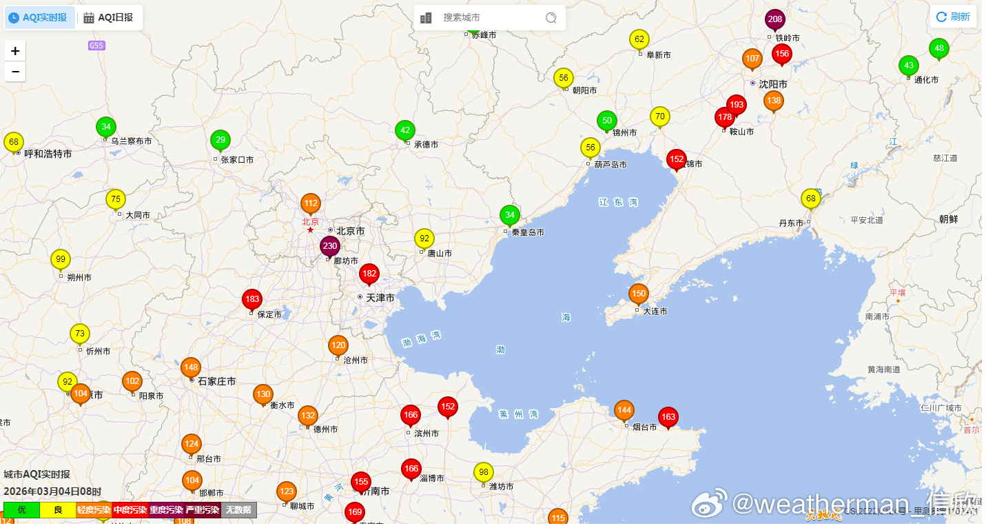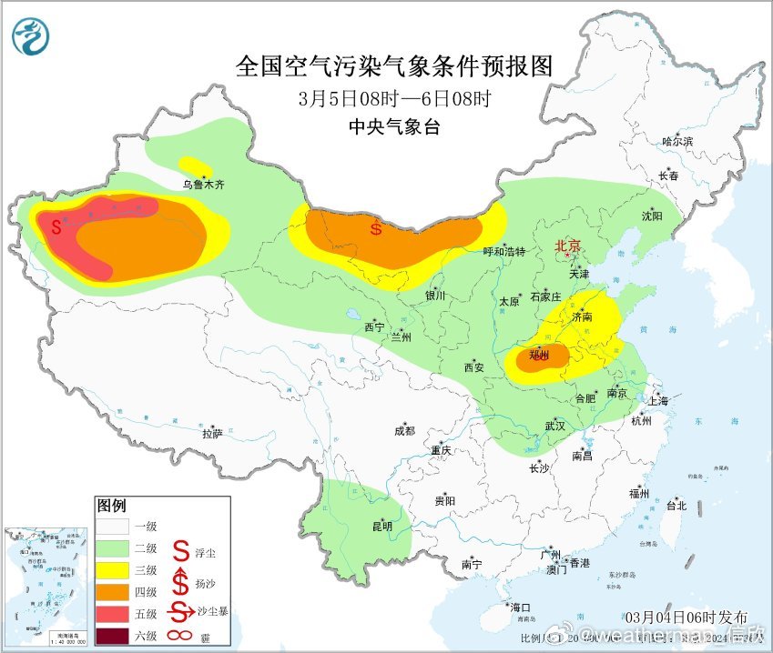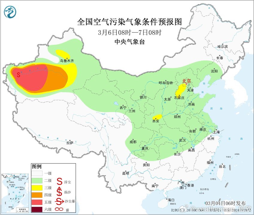 从今晨空气质量看,辽宁河北山东河南等地存在污染,对应有霾。今明2天,随着冷空气的到来,霾会逐渐减弱南下。而冷空气还会导致西北等地出现沙尘。4-5日,新疆南部、青海北部、内蒙古西部、甘肃中西部、宁夏、陕西北部等地的部分地区有扬沙或浮尘天气。
