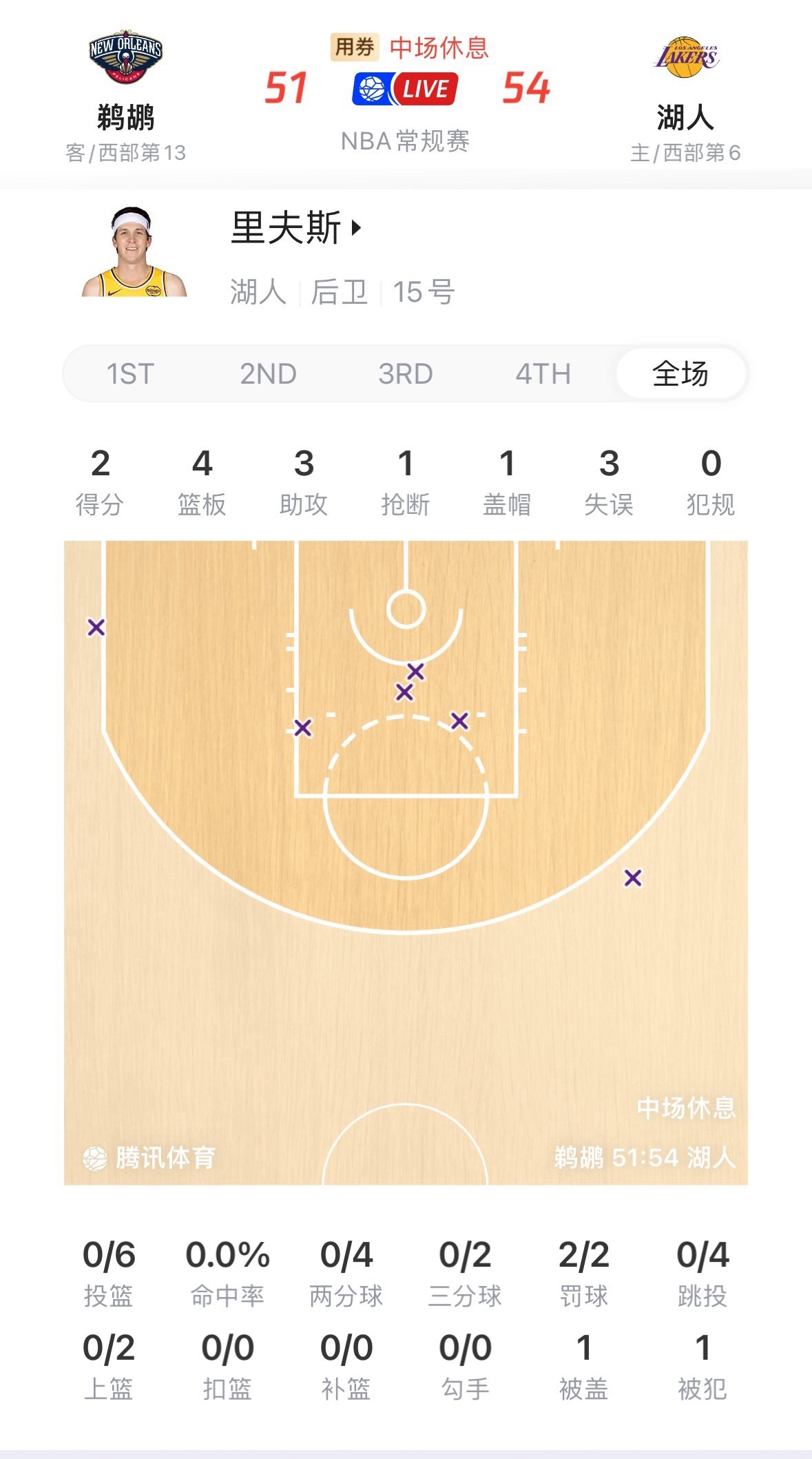 里夫斯半场表现糟糕,投篮6中0,2分4板3助攻3失误。