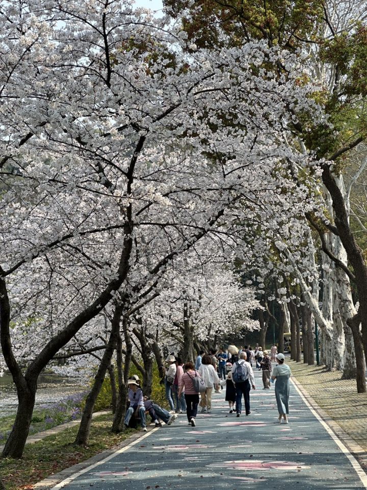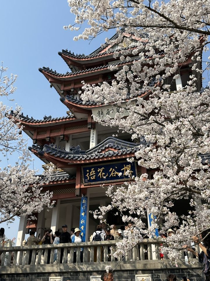 再往前推到2025年3月,她在无锡鼋头渚。那里的樱花也让她难忘,只能用“美极了”来形容。
