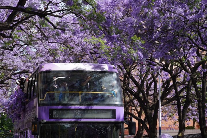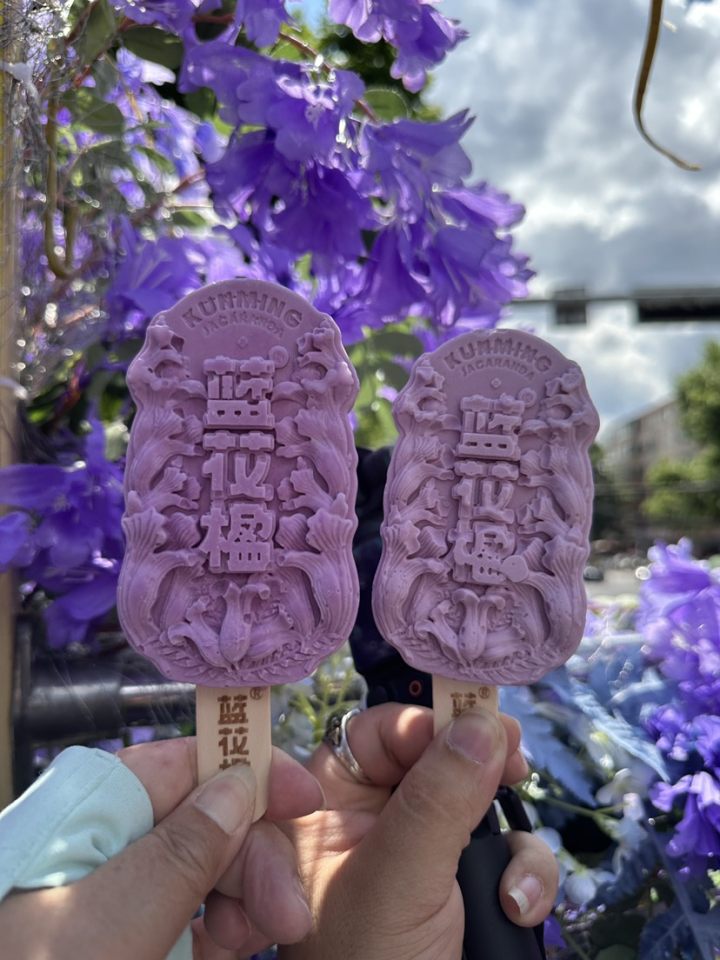 @梧桐雨:坐赏花观光车去观赏蓝花楹,尝尝好看的蓝花楹冰棍,非常应景