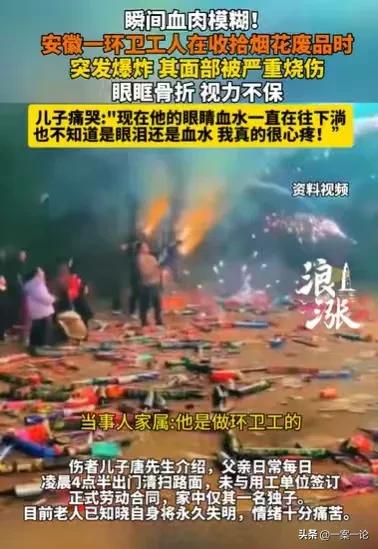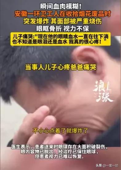 安徽,环卫工在打扫街道时,看到烟花废品,他非常兴奋,就去捡,打算拿来卖,结果在捡的过程中,烟花废品爆炸,他瞬间血肉模糊,脸被严重烧伤,眼眶骨折了,视力不保了,他很痛苦。 唐先生看着父亲躺在床上,眼眶里的血水一直往下淌,他不知道这些血水,到底是父亲的眼泪,还是眼眶的血水,他看着非常心疼父亲,他感受着父亲的痛苦,自己也非常难受。 他看着父亲,变成这个样子,他一时不知所措,都不知道以后的生活该怎么办了。 他的家中还有一个母亲,母亲脑梗,本就工作不了,还需要人照顾,在父亲没有出事之前,家中的经济,就靠父亲那每个月1000多元的工资维持着,家庭本就困难,现在更是雪上加霜了。 作为家中的独子,唐先生真的不知道该怎么办了。 唐先生的父亲唐大叔,更是不知道该怎么办,他躺在床上,知道自己失明了,他非常痛苦,他也非常后悔,早知如此,他怎么也不会去捡那些烟花废品。 说起唐大叔,他是一名环卫工人,平时凌晨4点起床就去清扫大街,每个月虽然只有1000多元的工资,但他能够照顾老伴,能够维持家中的经济支出,即使很辛苦,他也毫无怨言。 为了多一点收入,他在清扫大街的过程中,碰到可以买的废品,他都会捡起来,拿去卖,这多少也多一份收入。 以至于,当时他看到路边有燃放过的烟花废品,他真的很兴奋。 他看到那些烟花废品,已经燃放过了,那都是纸盒,那些纸盒又比较重,拿去卖也比较值钱。 他当时看到这些烟花废品,就想着赶紧把它们捡起来,然后再清扫街道,他下班之后就可以拿着这些烟花废品去卖,又可以多一笔收入,说不定,卖了这些烟花废品,就可以够一顿饭菜的钱了,他想想就高兴。 他快步走向烟花废品,就怕别人比他抢先一步,拿走了。 他把烟花废品一个一个地往袋子里装,越装越激动,就在他开心地笑起来时。 突然砰的一声,有一个烟花废品瞬间爆炸了,唐大叔只感到一阵疼痛,紧接着他就已经血肉模糊了。 这个意外,直接烧伤了唐大叔的脸,烟花爆炸冲击处正是他的眼眶,他的眼眶都被冲骨折了,眼睛里的内容物已经脱落,虽然经过治疗保住了眼球,但是难以恢复视力。 这一次意外,直接让唐大叔失明了,当他得知这个消息,自己也将成为儿子的累赘,他真的太痛苦了。 一次意外,让这个原本困难的家庭,雪上加霜。 唐大叔的这份环卫工作,其实与用人单位,并没有签订劳动合同,如今他伤得这么重,一切的费用可能都落到他儿子唐先生的身上。 唐先生看着父亲,感到身上的压力沉沉的,压得他快要透不过气来了。 因为父亲捡的是烟花废品,是要拿去卖的,这不属于工作范畴,父亲的伤可能很难被认定为工伤。 加上父亲和用人单位没有签订劳动合同,他想要从父亲的工作单位,获得工伤赔偿,可能会很难。 想到这里,唐先生沉默了,他都不知道该怎么帮到父亲。 唐先生的父亲遇到这样的事,确实让唐先生为难,母亲脑梗,父亲失明,儿子又是独生子,以后他又要照顾父亲,又要照顾母亲,还要挣钱养家,这压力确实很大。 环卫工作本来就比较辛苦,他父亲的工资又那么低,如今又出现这样的事,如果工作单位对他父亲这件事不管不顾,唐先生真的难以凑钱治好父亲。 眼下他要做的是,就是努力的地父亲证明父亲的伤属于工伤,只有这样,父亲才可以从用人单位获得一定的工伤赔偿。 唐大叔在工作期间,如果是违规捡拾烟花废品,是存在过错的,但清理烟花废品也属于工作内容,这种情况下,唐大叔受的伤属于工伤。 《工伤保险条例》第十四条明确规定,在工作时间和工作场所内,因工作原因受到事故伤害的,应当认定为工伤。 只要是工伤,就算是没有签订劳动合同,只要证明唐大叔和工作单位存在事实劳动关系,工作单位就应当承担工伤赔偿责任。 那么你对此事有何看法呢?