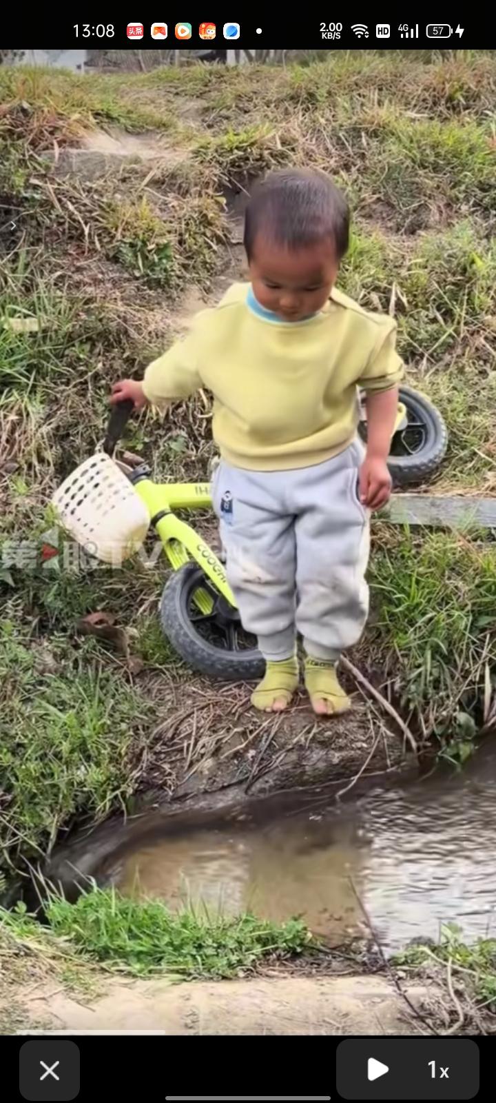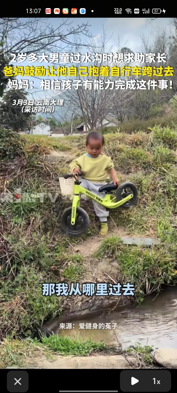 3月2日,云南大理。两岁大男童过水沟时求助家长,家长鼓励让他自己抱着自行车跨过去。孩子妈妈本身是学幼儿教育的,比较注重孩子的独立能力,相信孩子有能力完成这件事 孩子妈妈刘女士称,孩子从小光脚比较多,他有时候想穿会自己穿鞋子,袜子是因为经常在户外锻炼,所以那个袜子磨烂了,而且那个袜子的底是硅胶防滑的。后续会给孩子买新袜子,让孩子更好锻炼。