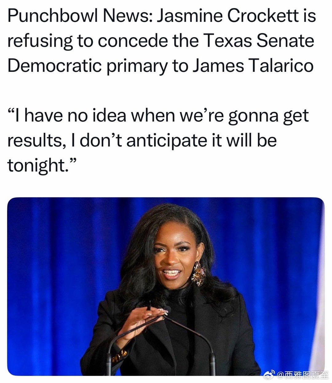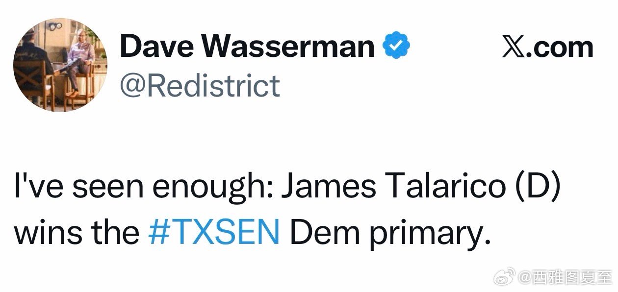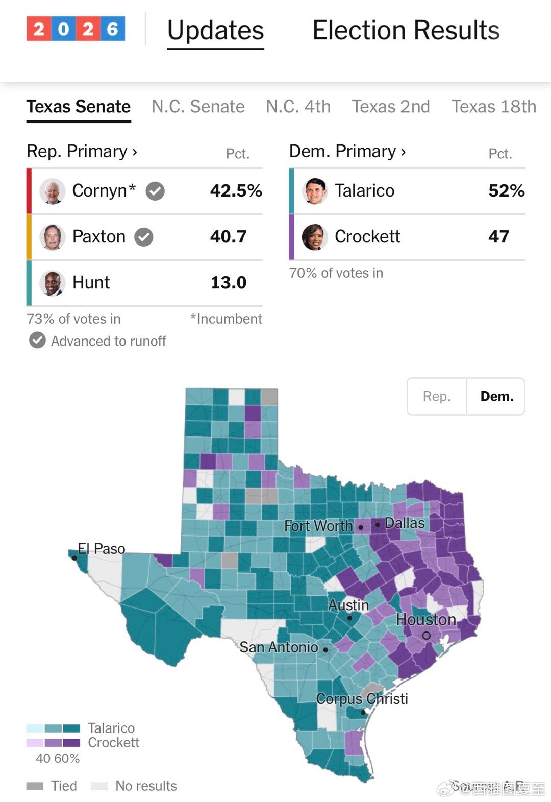 民主党两人,70%计票后,州议员Talarico52%vs 联邦议员Crockett 47%,选举专家认为其余的票不足以改变结果、已宣布Talarico赢得提名,但Crockett不认输,要等到明天
