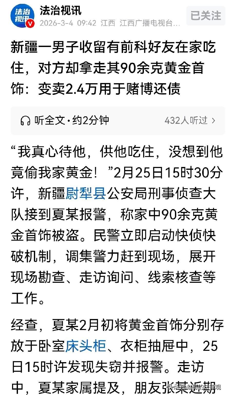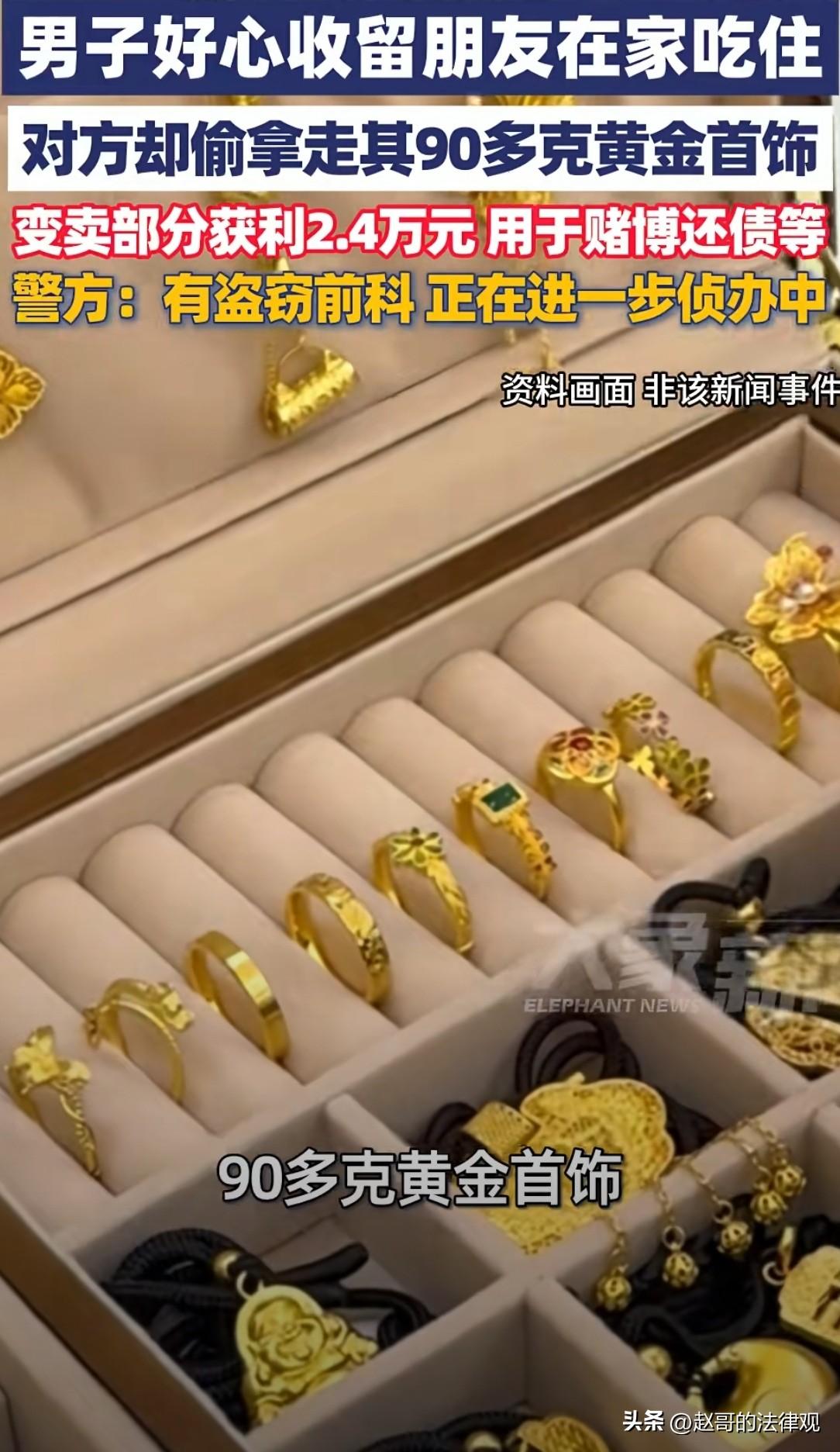 引狼入室!新疆尉犁,男子有个好友犯了事,刚从里边出来,无处可去,男子看他可怜就收留了他,管吃管住,没拿她当外人。不料,男子突然发现,家里90多克黄金首饰不见了,警方介入后,找到男子好友,并现场搜出黄金首饰5.18克,但其拒不承认,警方亮出证据,他立马哑口无言。 夏某怎么也没想到,自己一片好心,竟然是引狼入室。 2月25日下午3点多,夏某急匆匆跑去报警,气喘吁吁地跟民警说,家里90多克黄金首饰全没了。 那些金镯子、金项链,是他们夫妻,这些年一点一点攒下的。 平时因为干活不方便,舍不得带,就放在自家卧室床头柜,和衣柜抽屉里。 当天下午,他无意中发现,存放的金首饰没了,当时脑瓜子就嗡嗡的地。 民警来到现场发现,卧室床头柜的抽屉半开着,里面翻得有点乱,衣柜那边也是,衣服被挪动过。 夏某家属站在旁边,气的发抖。 她一个劲儿说,早知道就不该让那个人住家里。 夏某家属指的是张某,夏某说,张某是他朋友。 以前因为盗窃判过刑,出来以后没地方去,夏某看他可怜,就让他住在自己家。 管吃管住,一住就是挺长一段时间。 夏某平时在烧烤店忙,家里也没啥值钱东西,主要因为拿朋友没当外人,家里啥事也不瞒着他。 有时候聊天说起过,那些黄金首饰,张某都知道放哪儿。 民警一听这个,心里就有数了。 问清楚张某的长相和穿着,立即制定了抓捕计划。 当天下午4点多钟,就找到了张某的老窝把他抓获。 当时在现场搜出了一小部分黄金,有5.18克,其余可能已经被处理了。 被抓以后,张某嘴挺硬,不承认偷东西,说自己啥也不知道。 民警问他这几天去过哪儿,干过啥,他支支吾吾答不上来。 又问那5.18克黄金是哪来的,他说是自己的,但说不出具体啥时候买的、在哪买的。 民警经过查寻他这段时间的经济往来。 一查就查到了,2月5号,他在一家典当行有一笔进账,24000多块钱。 典当行的记录以及监控显示的得很清楚,当天张某拿了一些黄金首饰过去,称重、估价、拿钱,整个过程都有被拍的一清二楚。 这下张某没话说了,立马交代,2月4号晚上,他知道夏某一家都在烧烤店忙活,家里那个时间没人。 就偷偷溜回去,进卧室以后翻床头柜,又翻衣柜抽屉,把那些黄金首饰全装走了。 第二天坐车去库尔勒,找典当行卖了,到手24350块钱。 钱到手没几天,就已花得差不多了,一部分还了债,一部分拿去赌,剩下的乱花了。 夏某得知是好友干的这事儿,气的半天说不出话来。 自己这不是引狼入室,咎由自取吗。 自己对张某,真的很够哥们意思,吃住都没收过钱,想着朋友落难了帮一把,等他缓过来就好了。 哪知道人家惦记的是他家里那点金子。 案子还在侦办中,张某偷的东西,该退的要退,该赔的要赔,刑事责任也跑不了。 夏某那些黄金,能追回来的只有一小部分,大部分已经被卖掉,钱也花光了。 他后来想想,自己拿他当哥们,张某倒好,拿自己当了提款机。 早知道这样,当初说啥也不让张某住进家里。 有人说,夏某太实在,妥妥的交友不慎。 也有人说,张某这事干得太不地道,人家收留你,你反过来偷人家,良心过得去吗! 事实,这种熟人作案的情况,还真不少见。 有些人明着跟你称兄道弟,实际上早就在打你主意。 家里放贵重东西,最好还是多个心眼,别让外人知道。 尤其是那些有前科劣迹的,更要留个神。 夏某家的烧烤店还在开着,每天照样忙到半夜,但他他再也不会随便让人住家里了。 对此你怎么看? 关注@赵哥的法律观,欢迎评论区发表您的看法。