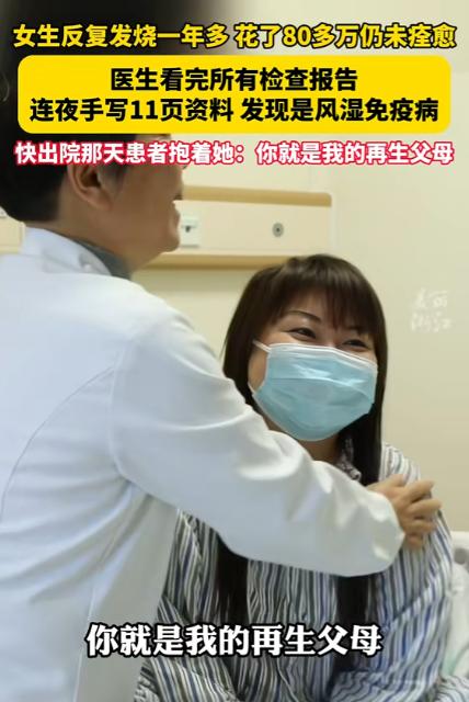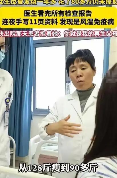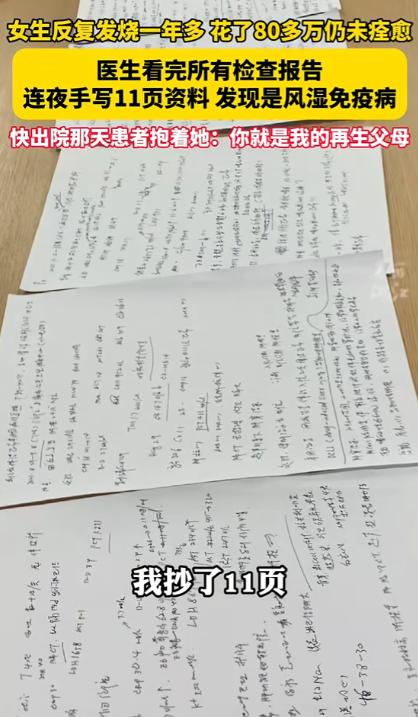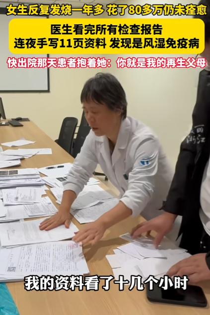 2024年,浙江一女子反复发烧一年多,为了治病花了80多万不见效,结果来到义乌求医后,医生花了十几个小时研究她的病例,而后一个举动惊呆众人,不料却找出问题所在,女子感恩称她为再生父母。 浙江36岁的陈女士(化名)从2023年开始,体温动不动就冲到39℃以上,吃退烧药、挂抗生素,当时能压下去,没过几天又卷土重来,一开始大家都以为是普通感冒、炎症,可越治越不对劲。 一年多时间里,陈女士辗转多家医院,检查单装了好几个袋子,医生的说法五花八门,有人怀疑血液病,有人说是疑难感染,有人认为是免疫问题。 钱像流水一样花出去,病却一点不见好,身体上的痛苦还能忍,精神上的反复打击最磨人,原本开朗爱美的陈女士,被折磨得憔悴不堪,家人跟着四处奔波,积蓄见底,连普通检查都要反复掂量。 那段时间陈女士几乎失去了活下去的信心,觉得自己这辈子可能就困在这场高烧里了。 抱着最后试一试的心态,陈女士来到义乌一家医院,接诊的是风湿免疫科主任许彩青,和其他医生不同,许主任没有立刻开一堆新检查,而是先让她把所有旧病历、化验单全部带来,满满两大袋资料,摊在桌上像一座小山,很多都是之前被判定“无明显异常”的报告。 接下来发生的一幕,让身边护士都看呆了,许主任没有依赖高精尖设备,而是做了一件在快节奏医院里显得格格不入的事,她把自己关在办公室,从早上八点一直研究到深夜十一点,整整十几个小时,饿了啃面包,渴了喝白开水,用一支普通红笔,在11页草稿纸上,亲手把一年多的体温、用药、各项指标按时间线抄录、比对、标注。 别人看报告只看当下结果,许主任却像考古一样,顺着时间轴一点点抠细节,就是这股死磕的劲儿,让她找到了两个被所有人忽略的关键线索:第一患者陈女士血清铁蛋白指标,竟然超出正常值200倍,这个数据藏在一堆常规指标里,一直没人重视。 陈女士每次高烧发作,抗核抗体就同步升高,用抗生素后体温暂时下降,这个指标反而反弹得更厉害,完全不符合普通感染的规律。 结合陈女士偶尔出现的手指轻微肿胀,许主任瞬间锁定病因:这不是细菌病毒感染,而是成人斯蒂尔病,一种发病率只有百万分之二的罕见自身免疫性疾病,是免疫系统内乱攻击自己身体,之前用的大量抗生素,不仅没用,还在加重病情。 真相大白治疗反而变得简单,许主任果断停掉所有抗生素,改用针对性的常规药物,仅仅三天折磨陈女士一年多的高烧彻底退了,一个月后体重回升、胃口恢复,三个月复查,各项指标全部正常。 出院那天陈女士紧紧握住许医生的手,泪流不止,直言她是再生父母,从绝望到重生,中间只差一位愿意沉下心、慢慢看、认真想的医生。 这件事之所以刷屏,不只是因为一个疑难病被治好,更戳中了很多人对看病的共鸣,现在医疗设备越来越先进,检查项目越来越全,可有时候越是依赖机器,越容易忽略最朴素的逻辑推理。 许医生没有用更贵的设备、做更多的检查,只是把已经有的信息看深、看透、连成线,用最笨的手写复盘,解开了82万都没搞定的难题,这也告诉我们,医学从来不是冷冰冰的仪器和数字,更是耐心、责任和不放弃每一个细节的坚持。 如今陈女士早已回归正常生活,能做饭、能接送孩子,家里重新有了烟火气,而许医生的11页手写笔记,也成了医院里的教科书,提醒着每一位医者:有时候,慢一点、细一点,才是对生命最好的负责。 麻烦看官老爷们右上角点击一下“关注”,既方便您进行讨论和分享,又能给您带来不一样的参与感,感谢您的支持!