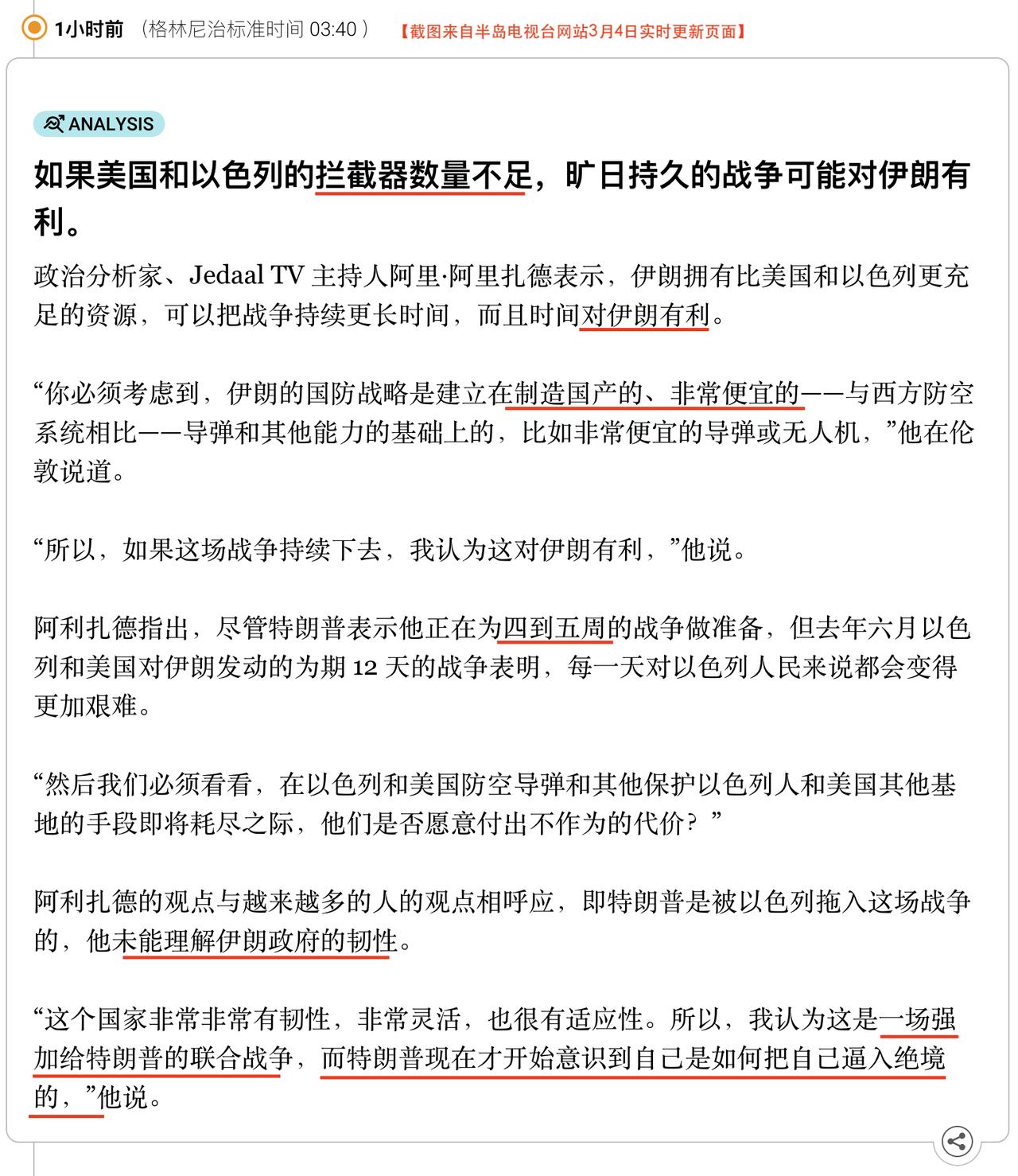特朗普的“酗酒者性格”终于把自己逼入绝境,他现在的言论已经语无伦次,竟然声称美国拥有无尽的战争资源,也许都忘记缺什么土了。美国部署在中东的拦截弹已经接近耗尽,而伊朗的先进导弹仍未大量使用,伊朗的无人机数以万计,这些无人机在俄乌战场上已经改写现代战争规则。现在,轮到中东的美国大兵来品尝新战争的滋味了——被无穷无尽的无人机狂轰滥炸! 浑水报告早就指出过,对伊战争很可能是为了掀翻特朗普而设下的政治圈套。而现在,越来越多的国际舆论认为“这是一场强加给特朗普的战争”、“而特朗普现在才开始意识到自己是如何把自己逼入绝境的。” 并且浑水报告也指出过,对特朗普来说,卢比奥是最危险的人。我现在越来越确信,卢比奥知道的越多,将来由他出面指控特朗普的罪行就越多。特朗普正在失去掌控大局的能力。而他身边的人正在评估这个后果,以决定下一步立场。 美国参议院很可能在周三审议一项决议,该决议将决定国会是否同意此次军事行动。众议院也在讨论这件事。尽管目前共和党在两院拥有多数席位,但美国的政治气氛一向被投机主义给主导,如果美军损失进一步扩大,美国民众的反对声音进一步升高,美国议员就会转向反对特朗普——无论民主党还是共和党,他们都会把反对特朗普当做实现个人政治利益的机会。 所以,伊朗要坚决扩大美军损失,同时注意在取得战果的同时留下相关视讯证据,积极利用网络渠道公布战果,为支持伊朗的正义声音提供扎实可靠的舆论素材,其中包括美以联军在伊朗犯下的罪行,也要及时公布。 笔杆子跟枪杆子一个都不能少,并且笔杆子的力量丝毫不比枪杆子差。伊朗需要把这场战争同时当做与世界网民相沟通的机会,纠正世界网民对伊朗的偏见与误解,树立现代文明国家的全新形象,并建立和开放国际援助渠道,这会让伊朗的胜算成倍增加。 后知后觉的特朗普正在把自己逼入绝境,狂妄自大的美国跟以色列也在把自己逼入绝境。美国航母已经撤退一艘,剩下的一艘必须令其崩溃。伊朗对中东机场的打击是正确的,务必确保美国加油机和运输机没有可以落脚的地方,伊朗无人机可以做到这一点。如此一来,美国将失去后勤保障,将失去继续战斗的关键支持。伊朗将赢得战场和舆论场的双重胜利。