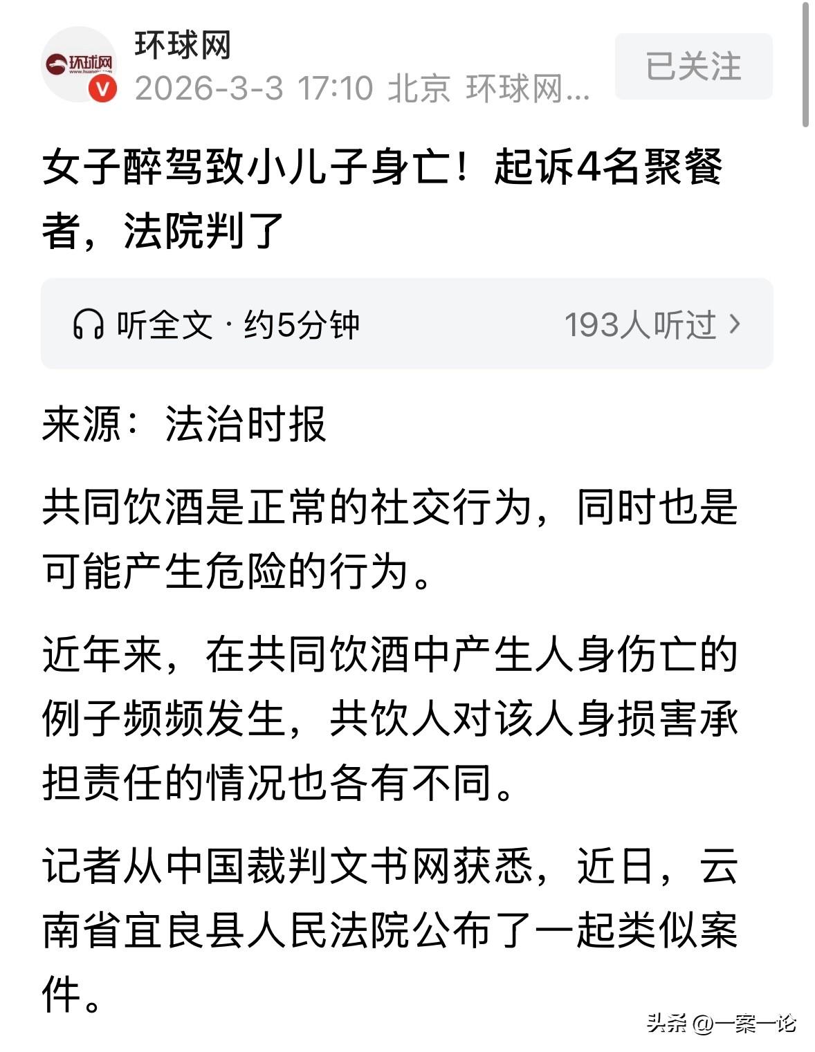 云南昆明,女子和家人朋友喝完酒,不顾朋友反对,醉醺醺地带俩孩子骑电动车回家,她让小儿子坐脚踏板上,大儿子则坐在身后的座椅上,没想到,由于车速太快,她撞上了一水泥支柱,车子侧翻,小儿子送医抢救无效死亡。事后,女子家人认为同饮4人没有尽到劝阻、照顾、护送义务,诉至法院索赔30万。结局亮了! 2024年12月16日凌晨3点23分,宜良县钰某路上一片死寂。骆某骑着电动自行车,车速不慢。 身前的脚踏板上,搁着个塑料板凳,坐着晃着小腿的次子杨某乙。身后座椅上,是长子杨某丙。 酒劲上头的骆某,视线早就模糊了。 车子沿路由东向西冲过去,“砰”的一声巨响,径直撞上了道路北侧绿化带里的凉亭水泥柱。电动车瞬间侧翻,碎片四溅。 这一撞,把骆某的酒撞醒了一半,也把这个家撞碎了。 次子杨某乙被甩出去,重重摔在地上。送到医院抢救无效,孩子没了。 骆某自己也受了轻伤,还因为这事儿,后来被法院判了交通肇事罪,有期徒刑1年,缓刑1年。 出事这天的经过,像放电影一样在骆某脑子里过了一遍又一遍。 12月15号下午,大家约在陈某家做饭。陈某喊了宋某,宋某又拉上武某,骆某则叫来了表姐夫沈某。 这顿饭吃得很热闹,酒也没少喝。到了晚上11点,兴致还没尽,几个人又转场去了KTV。在KTV里,啤酒又开了几瓶。 骆某心里清楚,自己喝高了。但她是组局的,也是好面子的,推杯换盏间,早就把适量两个字抛到了脑后。 凌晨2点,陈某和宋某先撤了。到了3点,沈某打了个车,也走了。 沈某心里可能觉得,都是成年人,各自回家各找各妈,应该没啥事。 现场只剩下骆某、武某和两个孩子。 武某看着骆某东倒西歪的样子,劝了一句:别骑车了。 可骆某不听,执意要带孩子走。武某不放心,骑着车跟在骆某后面护送了一段。 但他或许也觉得,只要看着骆某上了路,应该出不了大事,或者他自己也累了,没能坚持把人送到家门口。 就在这一段并不长的回家路上,骆某带着两个亲骨肉,让孩子永远地留在了那个黑夜里。 2025年,骆某和家属把陈某、宋某、武某、沈某四个人告上了法庭,索赔30多万。 在他们看来,这四个人太冷血。明明看着骆某喝醉了,明明知道她带着两个孩子,怎么就能让她一个人骑车走? 那来看看法院会怎么判。 根据《民法典》第1165条第1款:行为人因过错侵害他人民事权益造成损害的,应当承担侵权责任。 法条通俗来讲就是“谁有错谁担责”。 骆某作为成年人,明知醉酒不能骑车还硬要骑,还带着俩孩子,这是典型的自甘风险和重大过失,所以她自己背主要责任。 但是法律也规定,共同饮酒这个行为本身,会给同桌人带来一种注意义务。 虽然大家都是成年人,但既然坐在一张桌上喝酒,当有人喝醉了、失去自控能力时,尤其是像骆某这样还带着两个年幼的孩子,同饮者就不能拍拍屁股直接走人。 你得劝她别骑车,得把他安全送到家,或者通知家属。 法庭上,法官表示,骆某是亲妈,也是成年人。喝多少酒自己心里没数吗?带着孩子醉驾,孩子没了,她自己还要坐牢,这主要责任肯定是她自己背,没得跑。 但是,4个同饮的人也难逃责任。 陈某和宋某虽然走得早,但酒是一起喝的,人是你们约的,没把人安全送到家,这劝阻义务没尽到位。 沈某作为表姐夫,看着人醉成那样,还带着俩娃,自己打车溜了,这心里能安吗?照顾和护送的义务,你没尽到。 最让人纠结的是武某。他劝了,也跟了一段路。 但法官说:劝了没用,尤其是看着孩子坐在板凳上晃,你就放心让她走? 法官认为,武某的护送明显不足,光跟一段路不够,得确保人到家才算完。 这4个人的不作为,也就是没尽到该尽的照顾义务,虽然不是事故的直接原因,但和悲剧发生有一点点因果关系。 所以法院判他们承担“轻微过错”责任,每人掏点钱,既是惩罚他们的疏忽,也是提醒所有人:酒局不是吃完就散,对醉酒朋友的安全照顾。 最后,法院算账:骆某自己承担大头。但那4个人,因为没尽到“注意义务”,每个人都得掏点钱买教训。 宋某和陈某各赔1万,武某和沈某各赔1万5,加起来刚好5万块。 对于这件事,你怎么看? 欢迎关注@一案一论