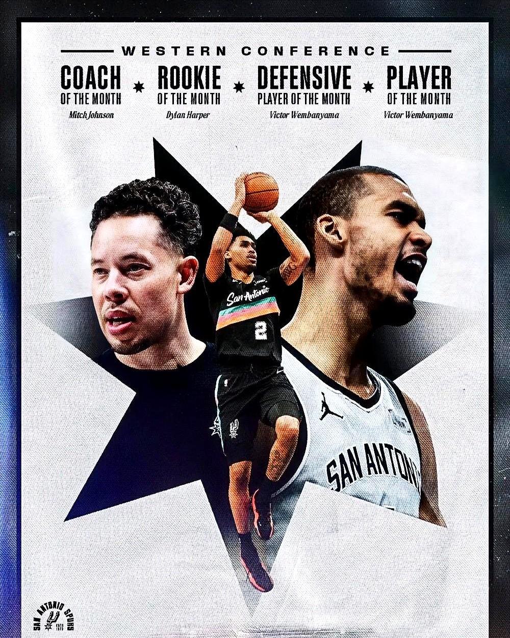 西部彻底变天了,不是雷霆,也不是掘金。 一支上赛季还在乐透区的球队,刚刚完成了NBA七十五年历史上前所未有的垄断。整个二月的西部,只剩下圣安东尼奥一个名字。 文班亚马在二月的每个夜晚,平均送出的不是盖帽,而是三记半的“禁止入内”通告。防守效率干到106.2,西部第一的铁幕,由这个三年级生一手拉起。 更沉默的是那个叫哈珀的新秀。场均12.5分看似温和,但那4.9次助攻,每一次都像精准的手术刀,切开对手防线。最佳新秀的奖杯,是对他冷静大脑的最高认可。 而这一切的导演,是站在场边的米奇·约翰逊。十一场胜利,无一败绩,每场得分破百。最佳教练的奖项,是对他构建这套精密机器的最佳注脚。 一个事实被清晰地摆上台面:当你的核心球员能同时包揽月最佳球员和最佳防守球员,这意味着攻防两端的统治,已彻底个人化。 马刺的崛起,撕碎了一个传统认知:重建需要漫长的等待。文班亚马的进化速度,直接按下了整个球队进程的快进键。他们缺的,或许只是一块最后的关键拼图。 想象一下,当这个已经能横扫月度所有奖项的怪物阵容,再嵌入一个顶级的四号位。西部,真的做好准备了吗?