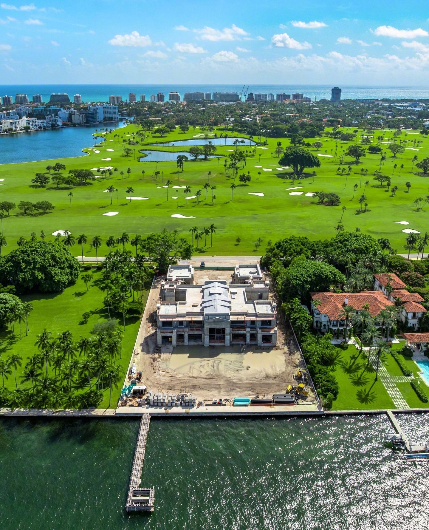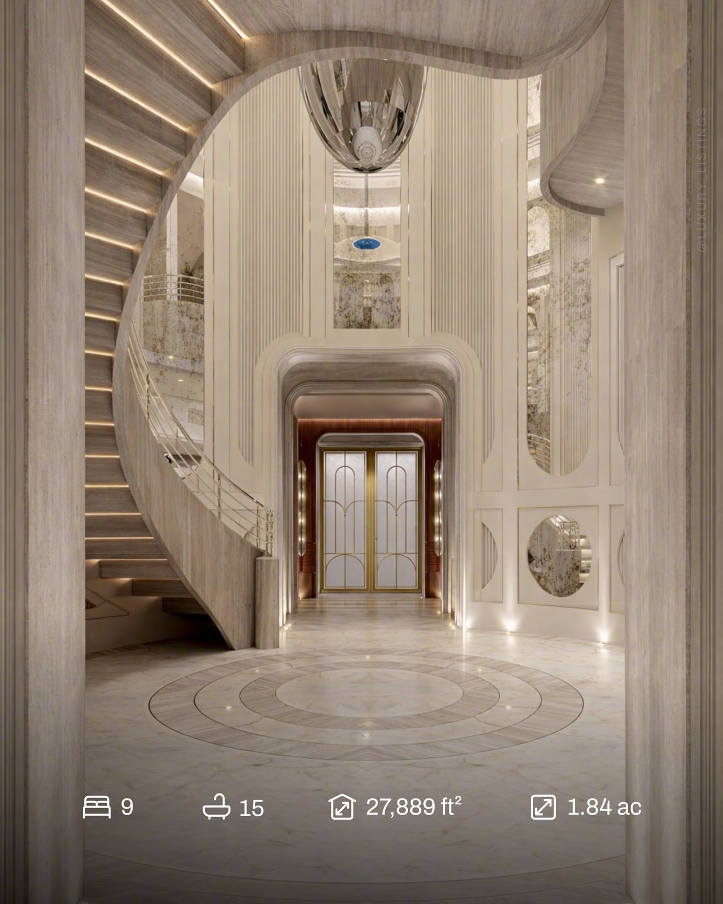 这栋豪宅的卖方为明星御用整形外科医生 Aaron Rollins 博士及其妻子、房地产经纪人 Marine Rollins。Rollins 夫妇于 2020 年以超过 3,000 万美元购得这块约 2 英亩的地块,室内面积达 27,889 平方英尺,拥有 200 英尺原生态海岸线。整座宅邸由世界知名设计师 ferrisrafauli 构想打造。从石灰岩立面到 38 英尺高天窗下的恢弘旋转楼梯,每一处细节都体现了顶级工艺水准。规划中的住宅包含 9 间卧室,总面积约 30,000 平方英尺,配备私人码头和游泳池。配套设施还包括健身房、美发沙龙和按摩室,以及一个 1,500 加仑的水族箱和一间带秘密通道的图书馆。Rollins 夫妇于 2025 年 11 月以 2 亿美元的价格将该房产挂牌出售。