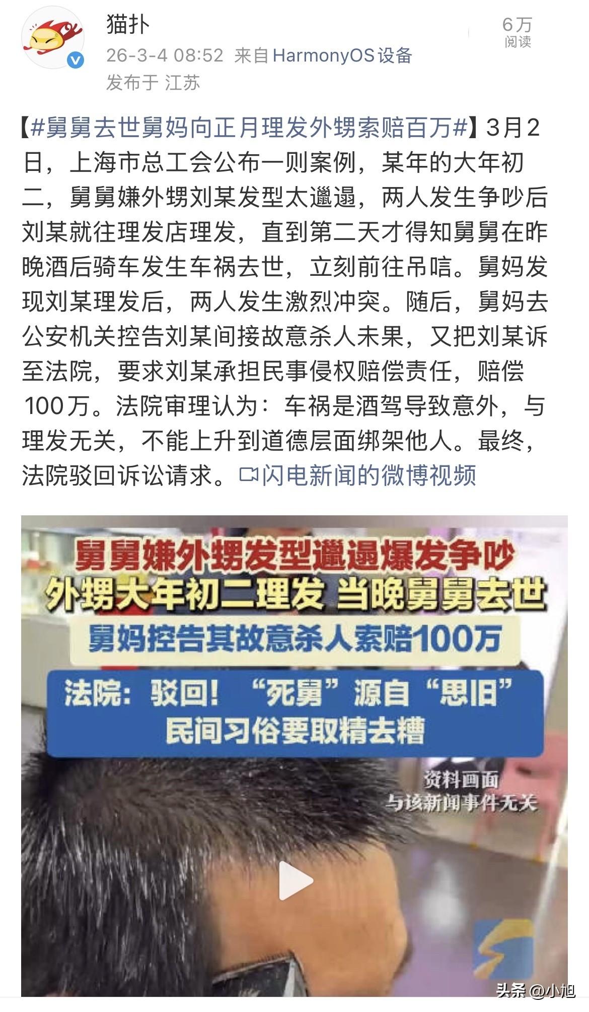 绝了!大年初二去理个发,居然被舅妈告上法庭,索赔100万,还说这是故意杀人。 事情发生在某年正月初二。外甥刘兵去舅舅家拜年,一进门就被舅舅嫌弃了。“你这头发跟鸡窝一样,过年前也不知道理一理?”舅舅皱着眉说。刘兵当时正玩手机,没吭声,这把舅舅惹火了。舅舅又补了一句:“大过年的看你这个形象,影响我运势。” 两人你一句我一句,吵了起来。刘兵火气上来,转身就出了门。他直接去了理发店,把头发剪短了。理完发也没再回舅舅家,找朋友喝酒去了。 第二天刘兵才知道,舅舅昨晚出事了。舅舅跟朋友喝完酒,骑电动车回家路上撞上了电线杆,人没了。刘兵赶紧跑去吊唁。 舅妈一看刘兵的新发型,当场就炸了。她指着刘兵的鼻子骂:“你明知道正月理发死舅舅,还故意去剪,你这不是咒他吗?” 舅舅的后事办完,舅妈没消气。她找了个大仙来算。大仙掐指一算,说刘兵明知有这个习俗还去理发,让舅舅心里不痛快,晚上喝酒比平时醉得快,这才出的车祸。大仙说,这叫间接故意杀人。 舅妈听完直接去了公安局,控告刘兵故意杀人。警方调查后,没立案。舅妈不甘心,又把刘兵告到法院,要赔100万。 法庭上,舅妈一口咬定,正月理发死舅舅这是老规矩,刘兵破了规矩,就得负责任。 法官没这么看。法院查得清楚,舅舅的死是酒驾导致的单方事故。监控录像、尸检报告、事故认定书都有,死因就是酒后骑车撞电线杆,跟刘兵理发没半点关系。 关于那句老话,法院也给了解释。“正月理发死舅舅”这句话,其实是清朝那会儿传下来的。当时汉人思念明朝,正月不剃头,叫“思旧”。后来传来传去,谐音成了“死舅”。 《掖县志》里写得明白:“闻诸乡老,谈前清下剃发之诏,于顺治四年正月实行。明朝体制一变,民间以剃发之故,思及旧君,故曰思旧,相沿既久,遂误作死舅。” 民俗专家也说了,正月不理发跟保护舅舅没直接关系。过年理发洗澡换新衣,是为了辞旧迎新,图个新气象。 二十四节气保护传承联盟的唐志强秘书长说,这个说法和“左眼跳财右眼跳灾”一样,没科学依据。 最后法院判了,驳回舅妈诉讼请求。法官说,民间习俗要取其精华去其糟粕,不能上升到道德层面绑架人,更不能拿迷信定别人的罪。 这个案子让人想起一个法律词,叫“迷信犯”。意思就是,有人出于迷信,用根本不可能实现犯罪结果的手段去干坏事,比如扎小人诅咒人。法律上,这种人不算犯罪,因为他的行为压根没危险性。 舅妈那个“大仙”的说法,就属于这类。可问题是,舅妈不光自己信,还要告到法院。这就不是迷信的事了,这叫滥用诉权。明明没理,还占着法庭资源不撒手。 刘兵摊上这事,也够倒霉的。跟舅舅吵一架,理个发,人没了。去吊唁,被舅妈骂。最后还成了被告,要赔100万。他做错了什么?就因为大年初二剪了个头? 舅妈丧夫之痛能理解。可悲痛归悲痛,不能找个外甥当出气筒。酒驾出事,怪不到理发头上。 你觉得舅妈索赔100万,该不该?