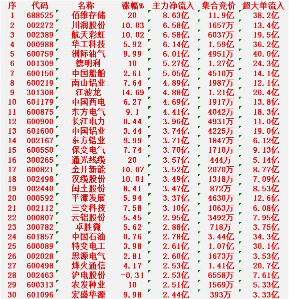 3月4日收盘,主力资金,已经大幅卖出的30名单: 紫金矿业:净流入 -18.8亿元 中际旭创:净流入 -18.0亿元 东方财富:净流入 -11.3亿元 新易盛:净流入 -11.1亿元 湖南黄金:净流入 -8.56亿元 协鑫集成:净流入 -6.88亿元 澜起科技:净流入 -6.37亿元 润泽科技:净流入 -6.25亿元 工业富联:净流入 -6.23亿元 宁德时代:净流入 -5.83亿元 3月3日收盘,主力资金“大幅买入”的30名单: 佰维存储:净流入 8.63亿元 川润股份:净流入 6.58亿元 航天彩虹:净流入 6.58亿元 华工科技:净流入 6.14亿元 洲际油气:净流入 6.01亿元 德明利:净流入 5.27亿元 中国船舶:净流入 5.05亿元 南山铝业:净流入 4.89亿元 江波龙:净流入 4.88亿元 中国西电:净流入 4.69亿元 东方电气:净流入 4.41亿元 长江电力:净流入 3.96亿元 中国铝业:净流入 3.74亿元 东方锆业:净流入 3.71亿元 保变电气:净流入 3.70亿元 通光线缆:净流入 3.57亿元 金开新能:净流入 3.52亿元 汉缆股份:净流入 3.49亿元 闰土股份:净流入 3.47亿元 平潭发展:净流入 3.37亿元
