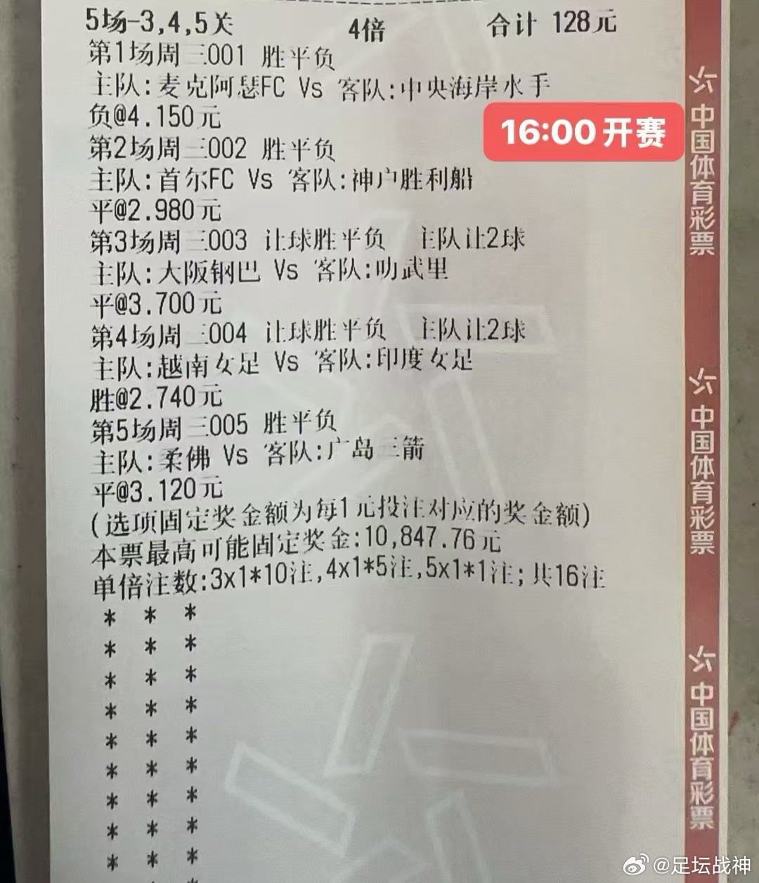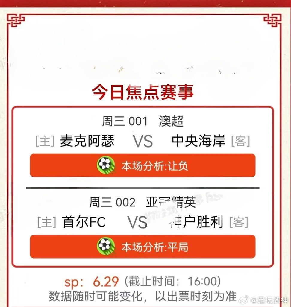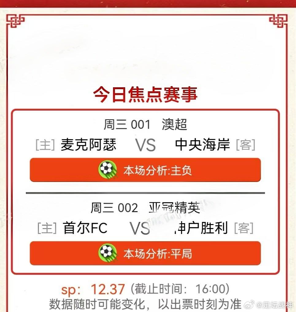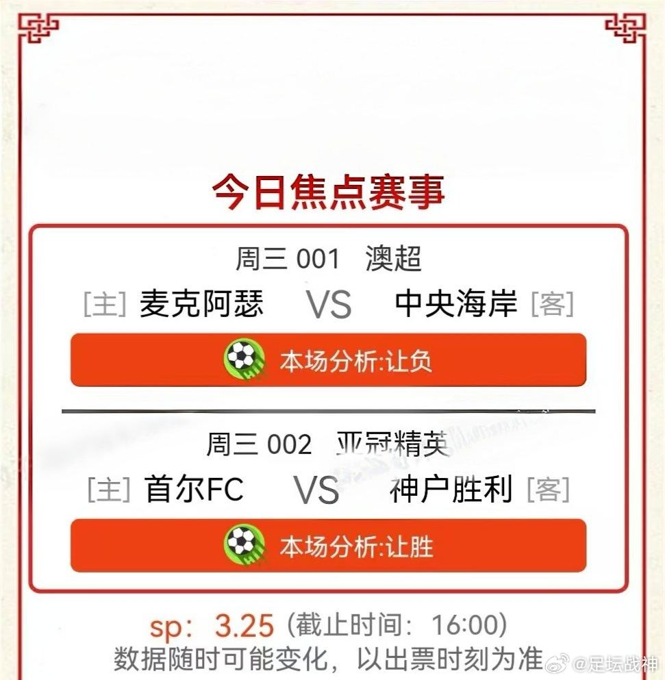 3月4日001 麦克阿瑟 VS 中央海岸水手002 FC 首尔 VS 神户胜利船