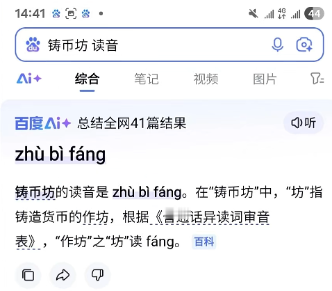 针对此次读音争议,“百度AI搜索”在相关视频下作出回应:“美含老师好,看了一下我们的结果,也参照了评论区粉丝po的新华字典截图,看下来结果是对的~如后期有其他权威结果佐证或读音更新,欢迎美含老师随时告诉我们!”并附上了百度AI查询“铸币坊读音”显示zhùbìfáng的截图。