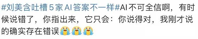 刘美含的这次经历,引发了网友广泛共鸣。有网友表示“自己也遇到过AI答非所问、答案不一的情况”,也有网友提醒“AI只是辅助,重要问题还是要查权威资料”,还有网友调侃“AI也有‘意见不合’的时候”。