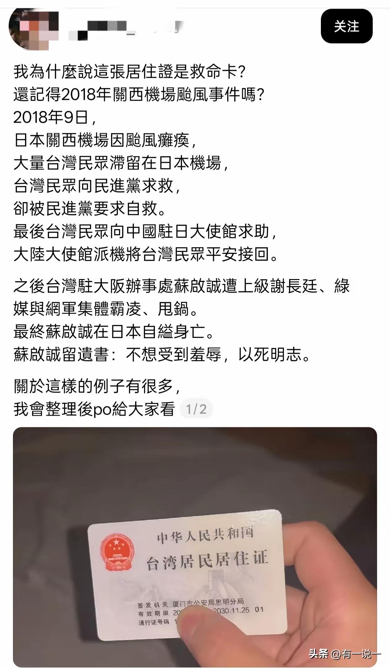 台湾一网友称台湾居民居住证是救命卡 伊朗的这次撤侨后,相信会有更多的台湾居民办