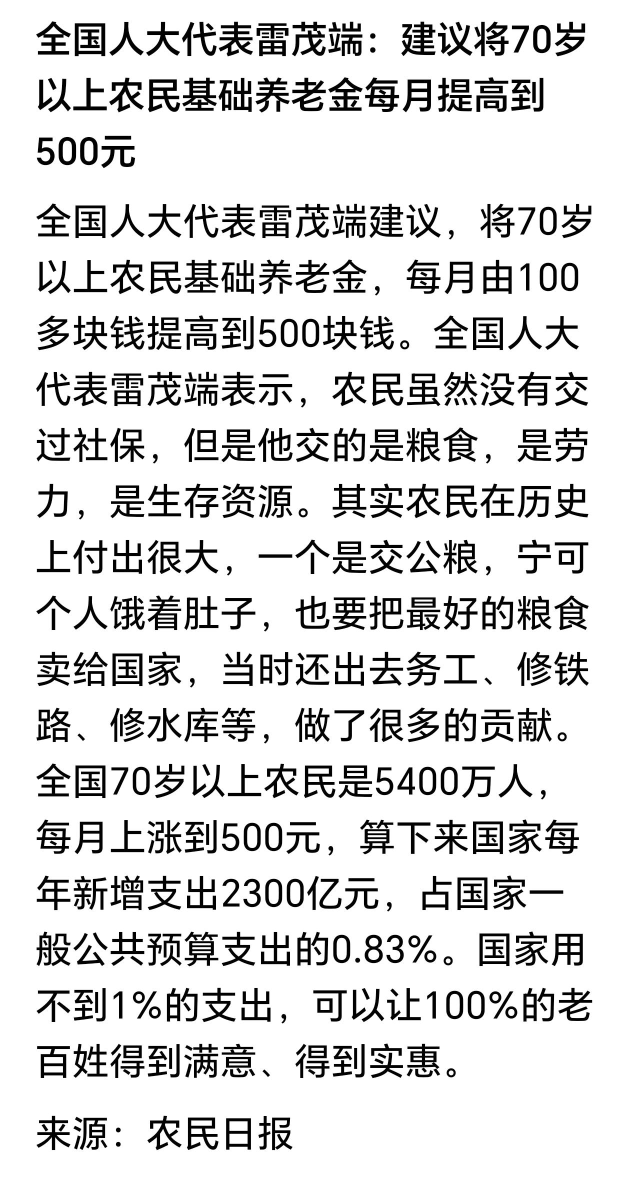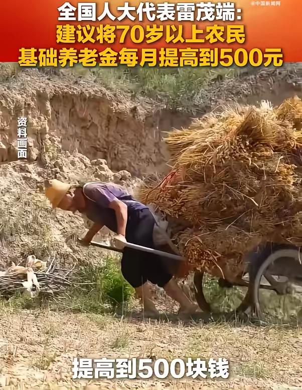 来自基层的全国人大代表雷茂端建议,将年满七十岁的农村居民基础养老金标准提高到每月五百元,这一提议包含了对农民朋友的感情,代表了广大农民群众的共同期盼,如果能够很快落实了,将与免除农业税一样,成为党和政府改善民生的又一项惠民工程,必将载入史册。