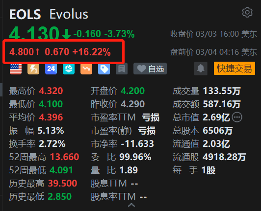 医美上市公司Evolus(EOLS.US)盘前涨16.22%报4.8美元。消息上,Evolus报告称,2025年第四季度实现了盈亏平衡,而一年前亏损了0.11;截至12月31日的三个月内,收入从一年前的7,890万增长至9,030万。该公司预计2026年的收入将在3.27亿到3.37亿之间。
