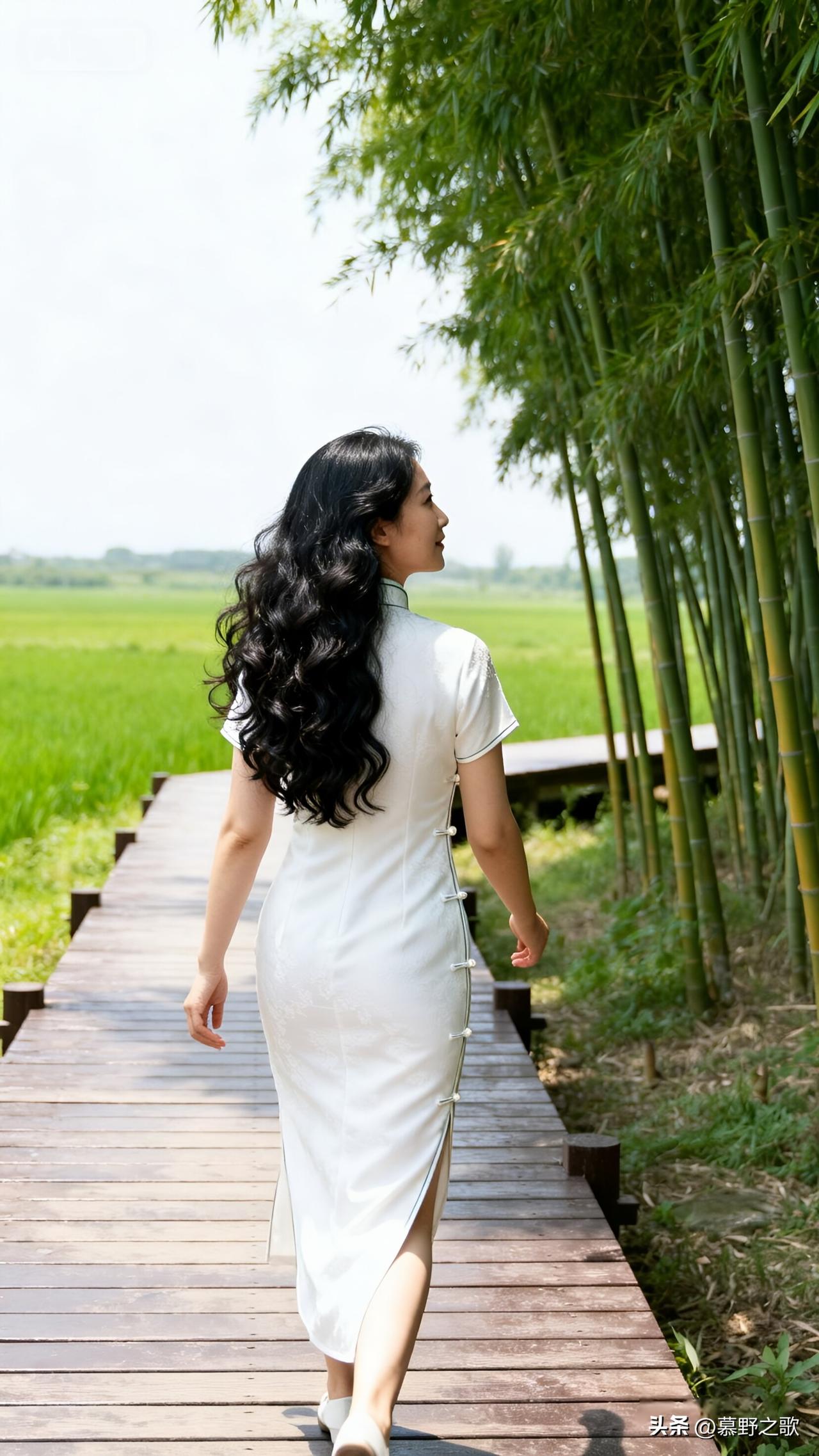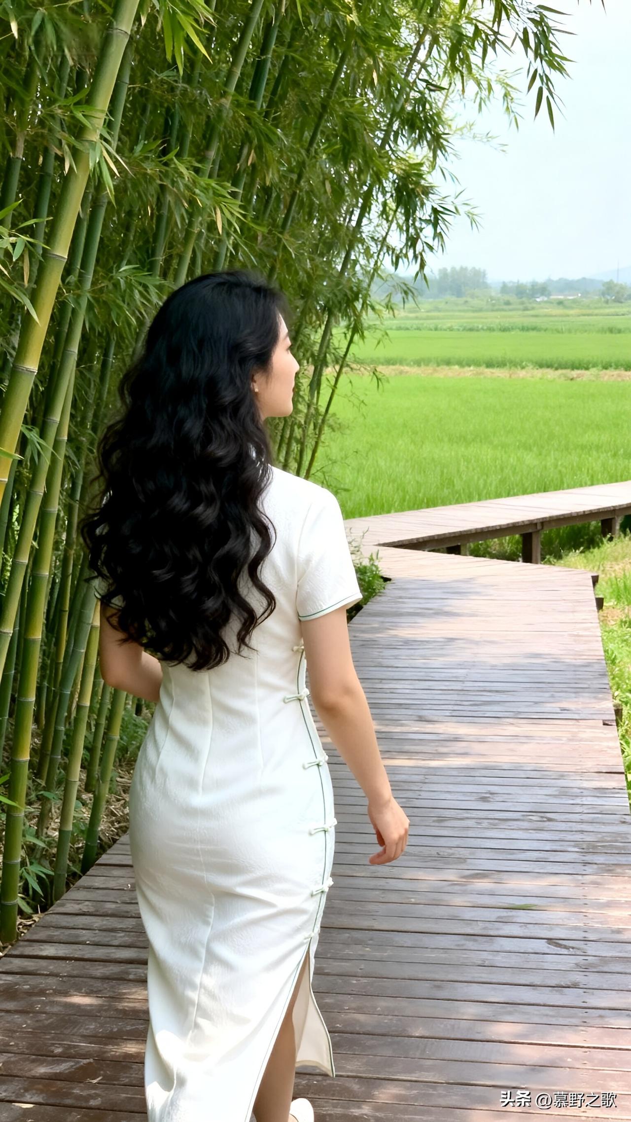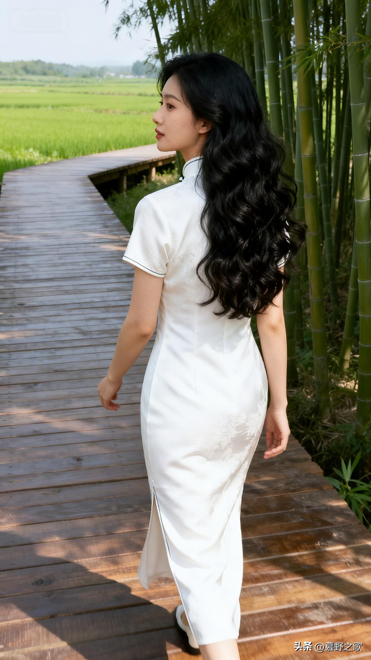走在竹林的木栈道上,竹叶在头顶沙沙作响。白色旗袍的开衩处,风钻进来,凉丝丝的。远处是青绿色的稻田,像一块被揉皱的绿绸。我回头望,长发卷成波浪,贴在旗袍的暗纹上。原来东方的美,从不是张扬的,而是藏在衣袂翻飞的弧度里,藏在山水之间的留白里。 美女人像群 旗袍写真 国风穿搭 竹林漫步
