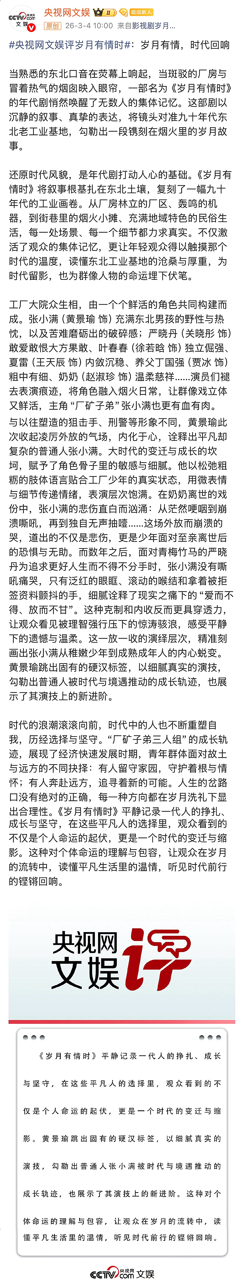 央视网文娱评岁月有情时 央视网的点评真的太精准了!《岁月有情时》这部剧把旧时光里的人情冷暖,拍得细腻又真实,没有刻意的煽情,却用最朴素的故事,讲出了一代人的青春与不舍,真的越看越有味道~电视剧岁月有情时