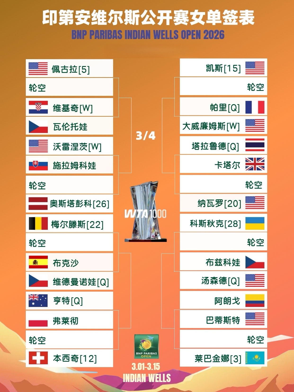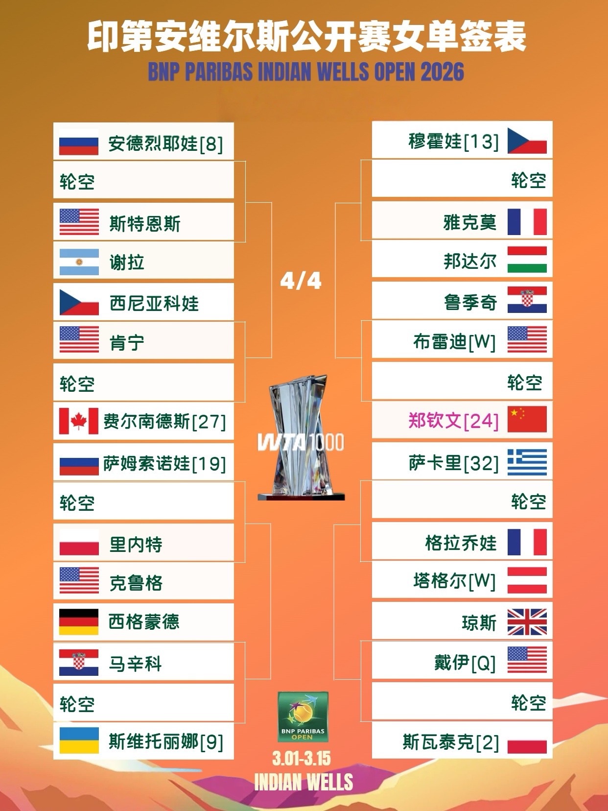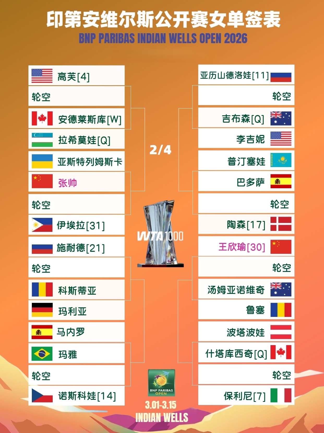 郑钦文王欣瑜张帅出战印第安维尔斯公开赛 全年第一站男女1000级别综合赛事——印第安维尔斯公开赛正赛将于北京时间3月5日凌晨开打。女单资格赛已经完成,正赛完整签表如图👆🏻🎱前8种子对位情况:1/4区:🇧🇾萨巴伦卡-🇺🇸阿尼西莫娃2/4区:🇺🇸高芙-🇮🇹保利尼3/4区:🇺🇸佩古拉-🇰🇿莱巴金娜4/4区:🇷🇺安德烈耶娃-🇵🇱斯瓦泰克🇨🇳中国球员首轮对阵情况:-郑钦文[24]首轮轮空,次轮对阵🇭🇷鲁季奇/🇺🇸布雷迪[W]-王欣瑜[30]首轮轮空,次轮对阵🇦🇺汤姆亚诺维奇/🇷🇴鲁塞-张帅首轮对阵🇺🇦亚斯特列姆斯卡去年8强球员保分压力:🇷🇺安德烈耶娃1000分🇧🇾萨巴伦卡650分🇺🇸凯斯/🇵🇱斯瓦泰克390分🇨🇳郑钦文/🇨🇭本西奇/🇷🇺萨姆索诺娃/🇺🇦斯维托丽娜215分一起为中国金花加油!