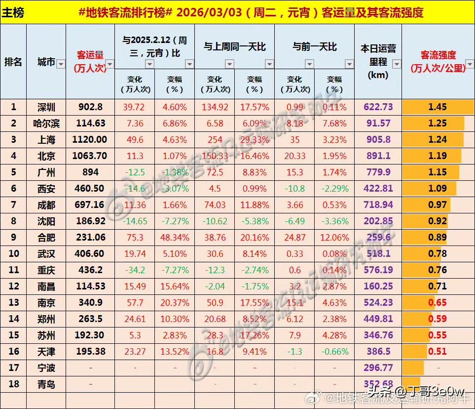 广州地铁客流量昨日894万人次多,连续两天低于深圳[呲牙][呲牙][呲牙] 爆料 身边事 地铁客流排行榜 中国地铁客流日报 昨日客流 排行榜 广州 深圳 周二 3月3日 星期二 全国地铁客流量城市排行榜: 上海1120.0万 北京1063.70万 北京身边事 深圳903.8万 广州894.0万 广州地铁 成都697.16万 西安460.50万 西安爆料 重庆436.20万重庆身边事 武汉406.60万 南京340.90万南京地铁 郑州263.50万郑州地铁 合肥231.06万 天津195.38萬天津身边事 苏州192.30万苏州爆料 沈阳186.92万沈阳地铁 宁波114万+ 青岛114万+青岛爆料 哈尔滨114.63万 哈尔滨身边事 南昌114.53万