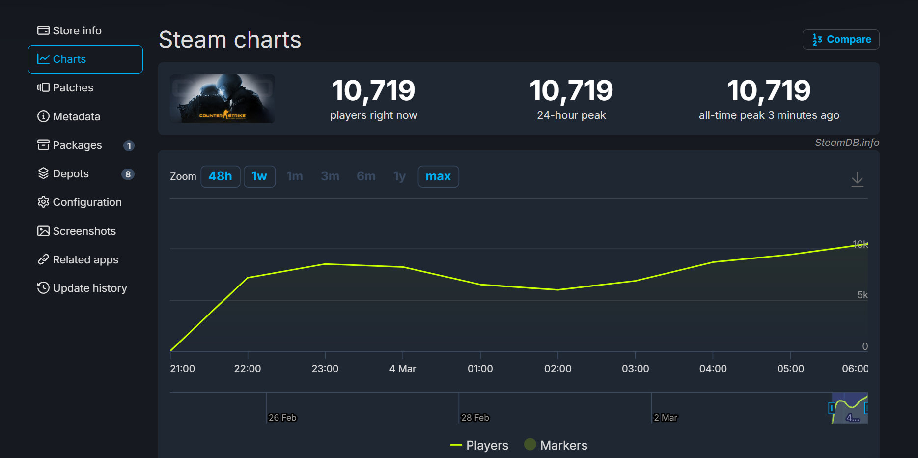 《CS:GO》现已重新拥有独立商店页面,玩家可免费下载安装。SteamDB数据显