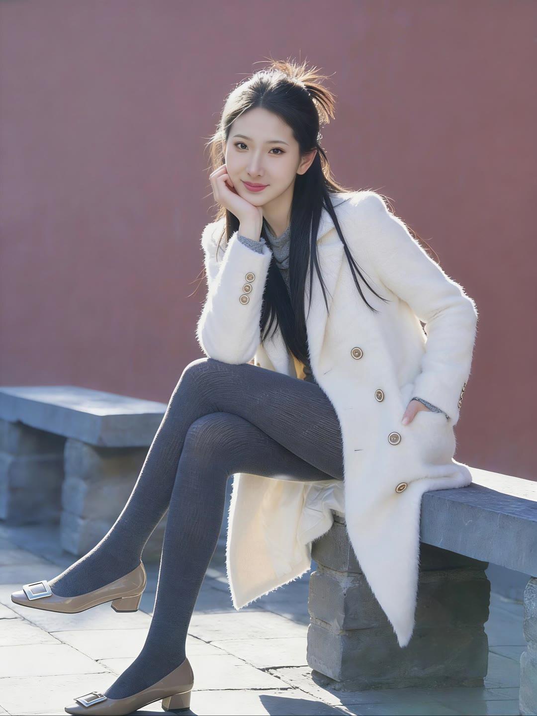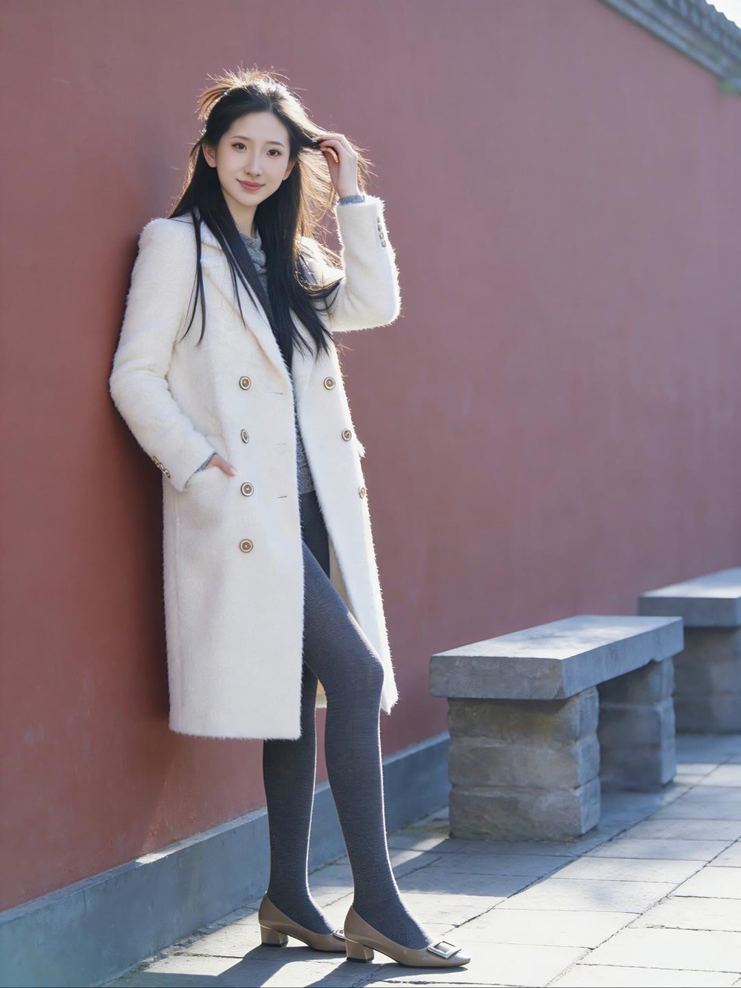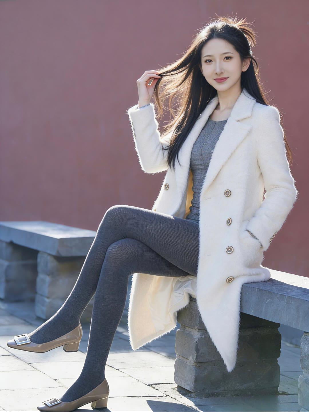 冬日暖阳下的优雅穿搭,白色大衣与灰色丝袜的完美搭配,尽显温柔与时尚。