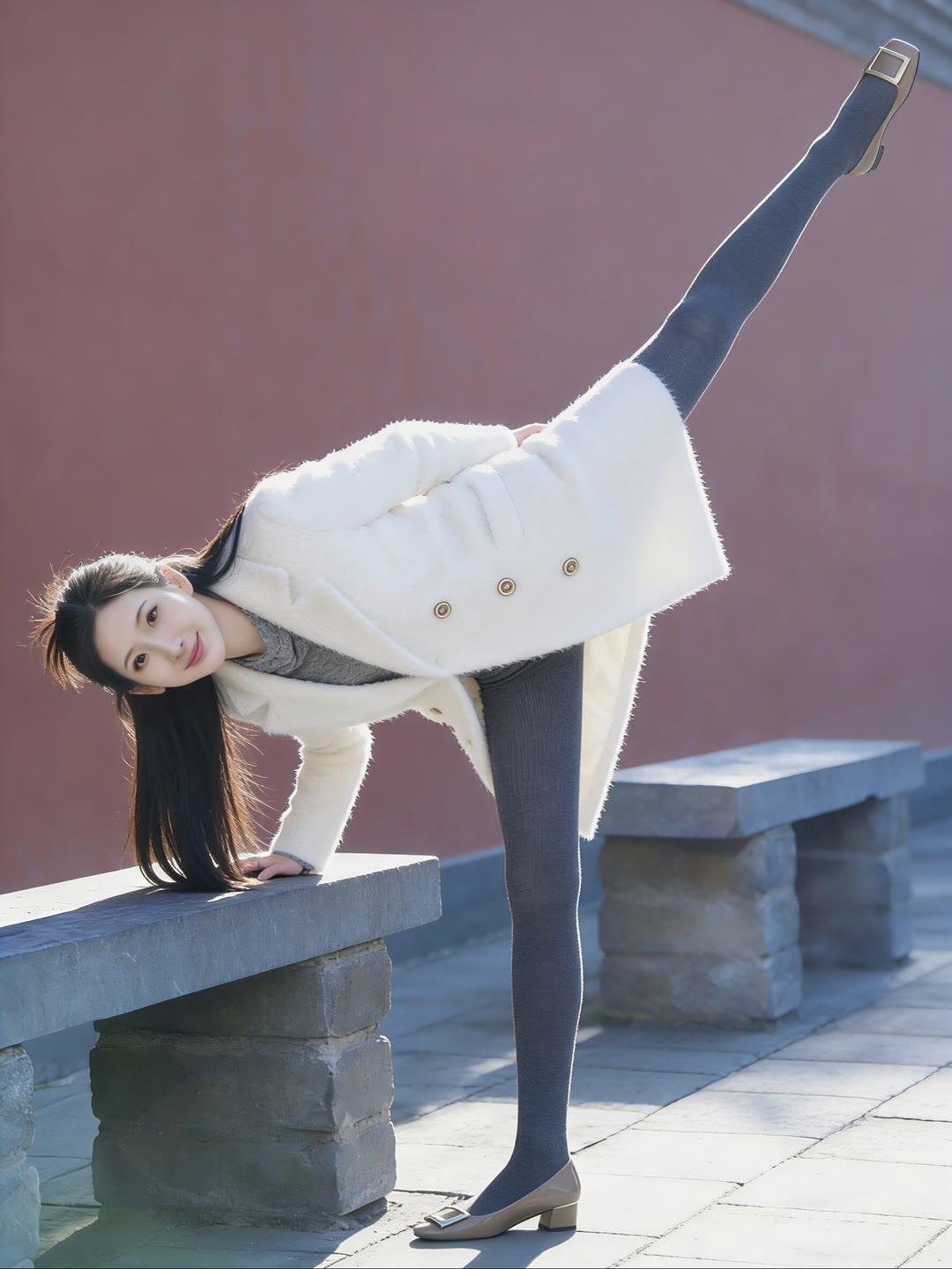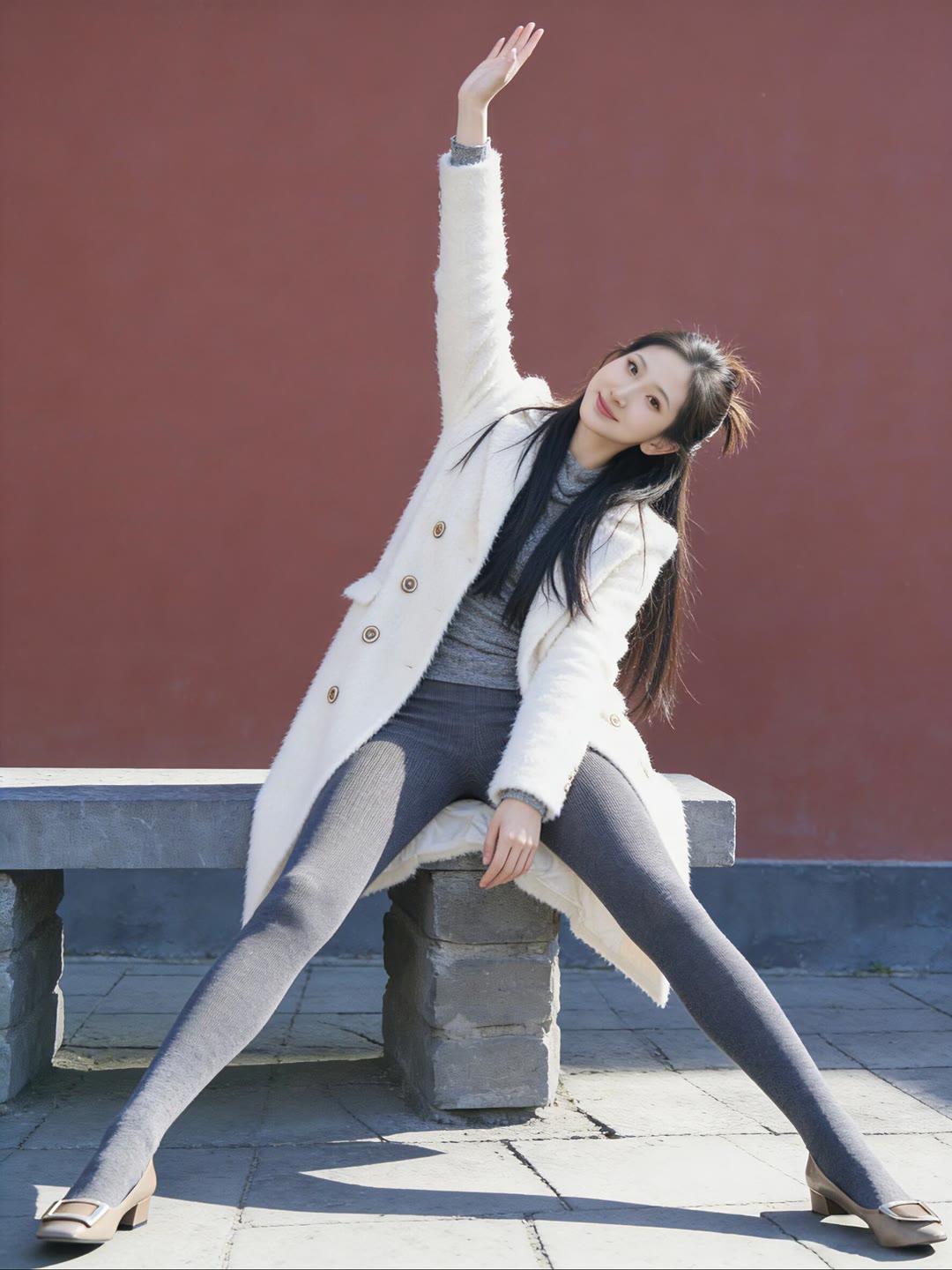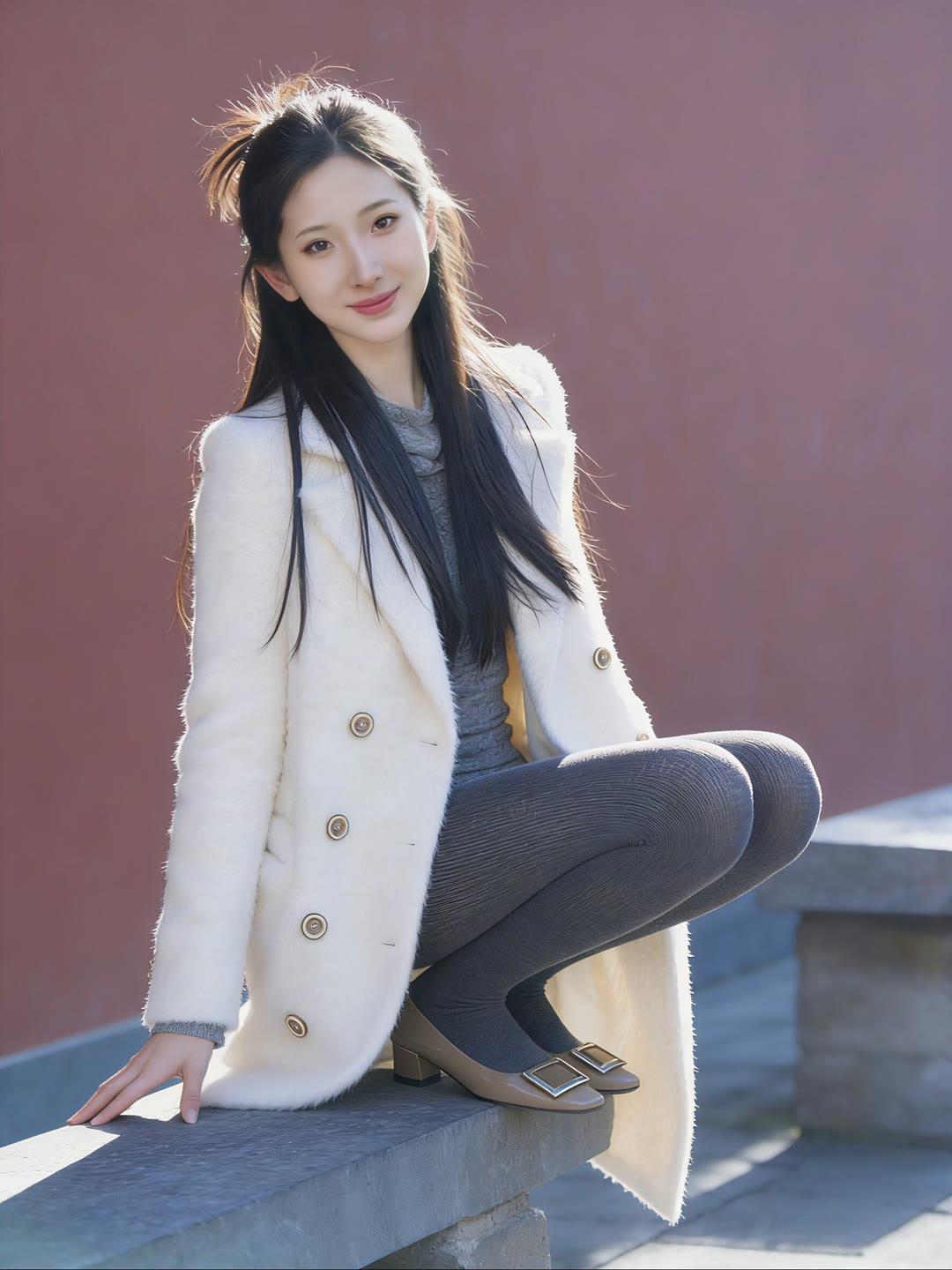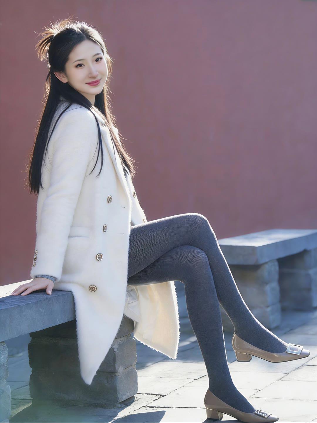 冬日暖阳下的优雅穿搭,白色大衣与灰色丝袜的完美搭配,尽显温柔与时尚。