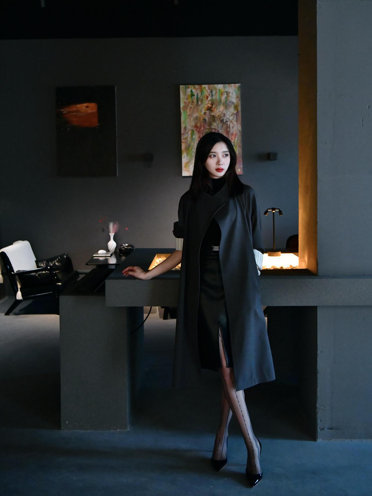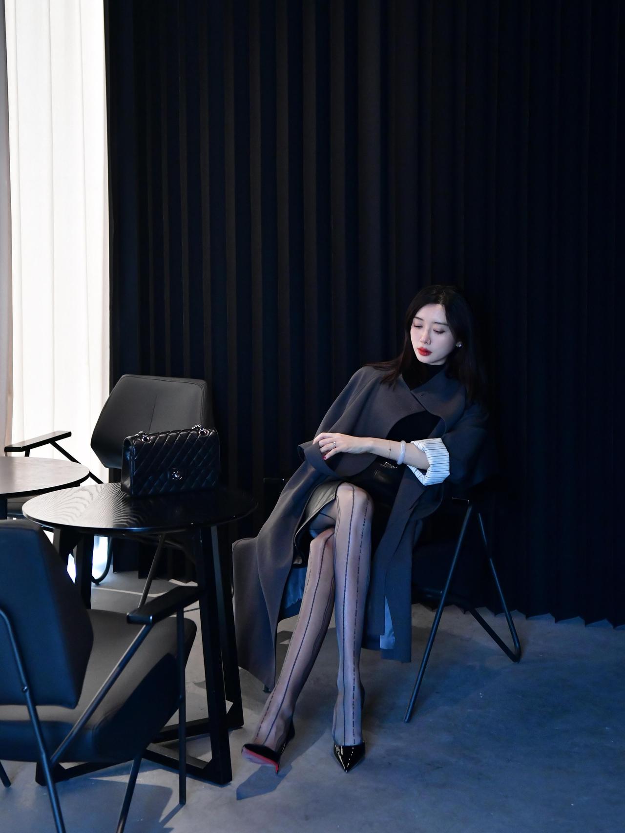 黑色高领短裙裹着曲线,过膝长靴踩在斑马线上,每一步都带着笃定。风掀起裙摆,露出一