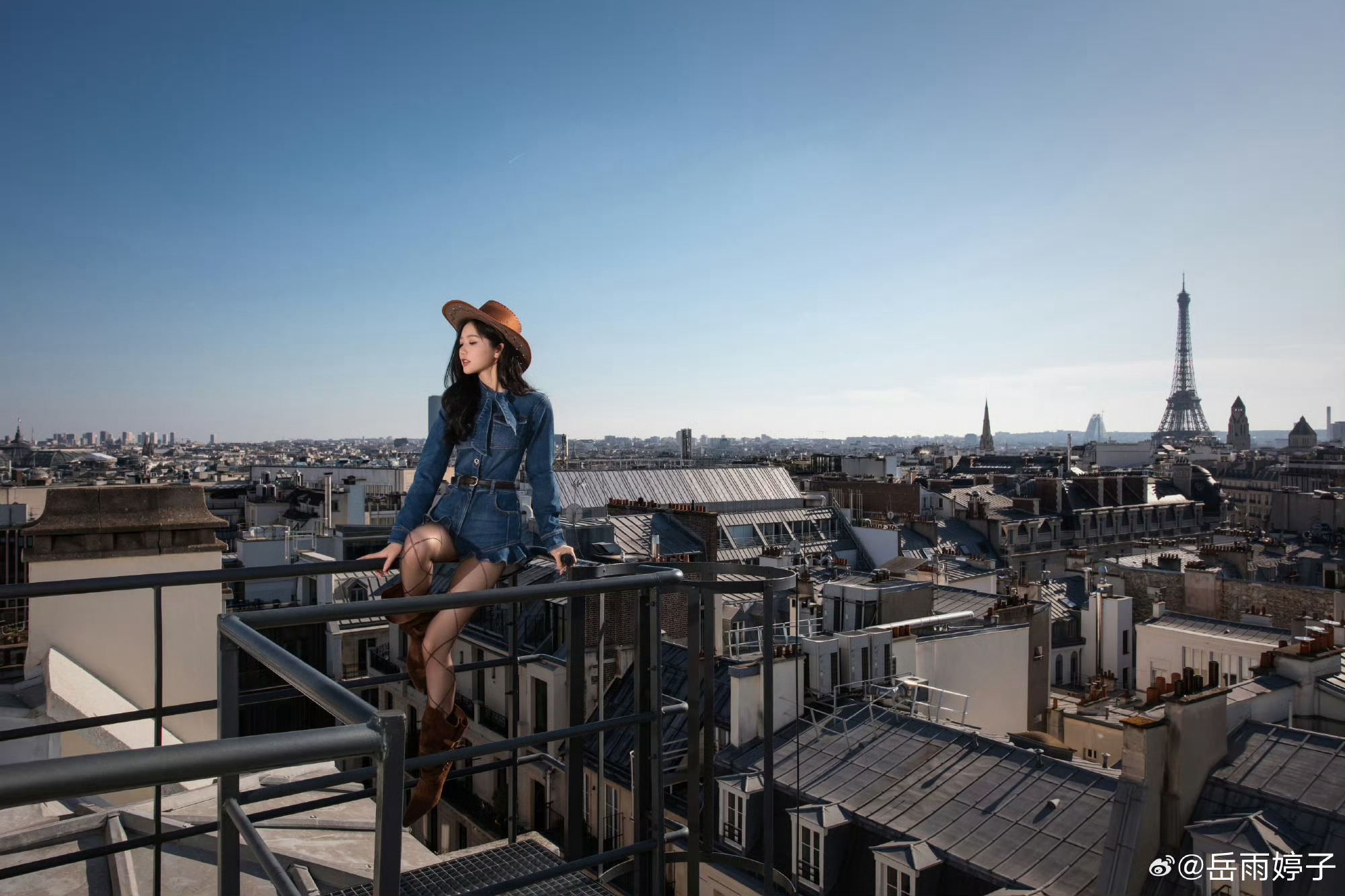 岳雨婷时装周街拍大事很妙 今天巴黎的街拍造型大事很妙!一身牛仔衣搭配牛仔帽,酷帅又率性。与巴黎的风景对话,脚下是岁月斑驳的屋檐,远处是浪漫永恒的天际线,人也成为这幅风景的一部分。