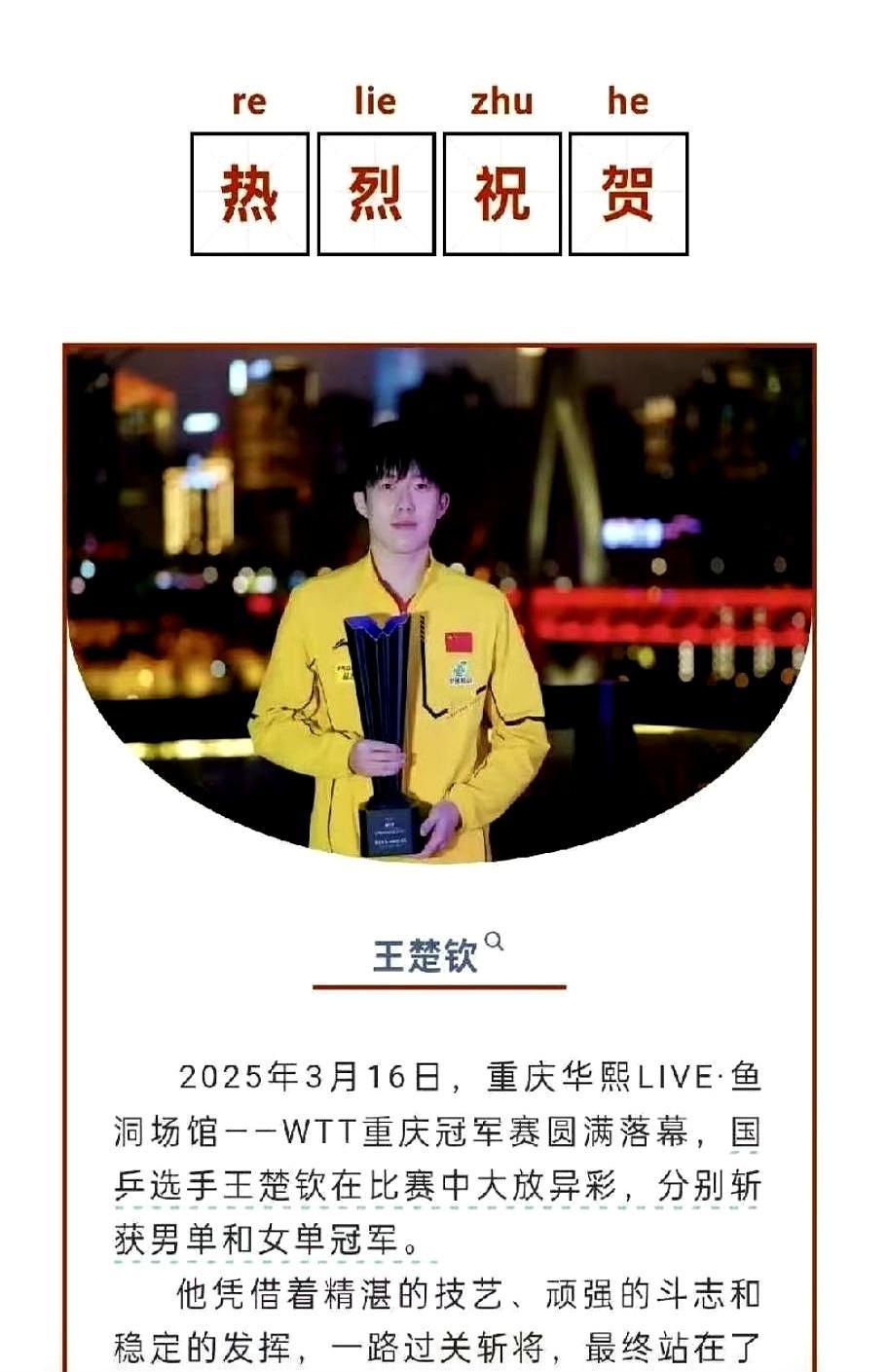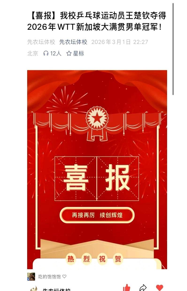35分钟,4比0,他把对手钉在决赛台上。王楚钦夺冠后,母校先农坛体校的喜报里,偏