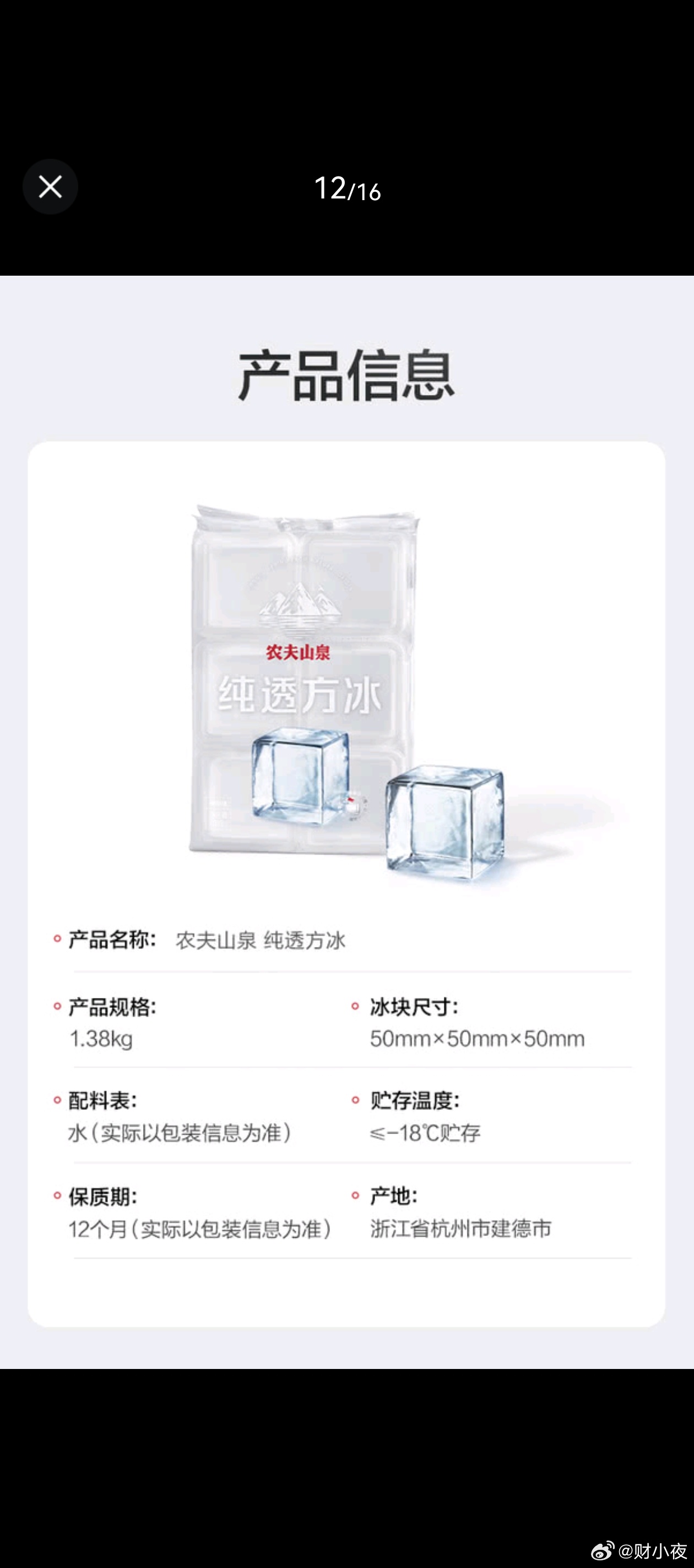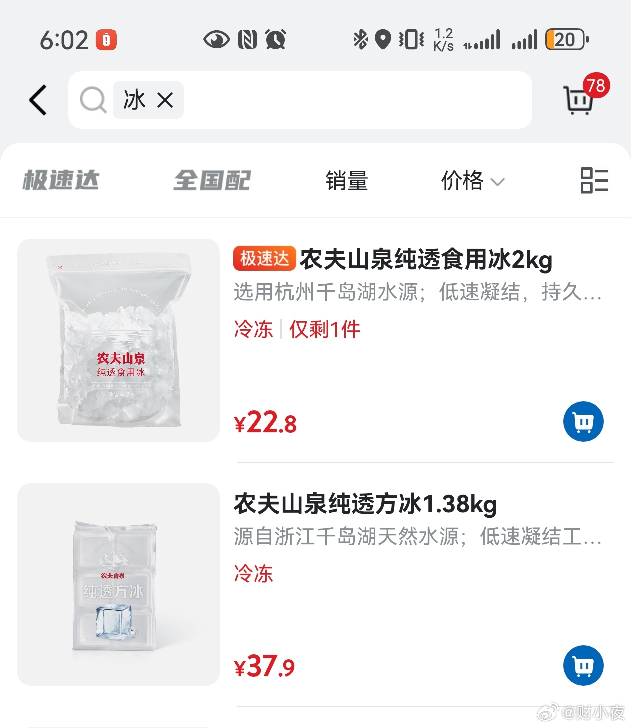 一种是22.8元的普通实用冰,一种是37.9元的方冰,都是农夫山泉,方冰就是很规整的方形冰块。
