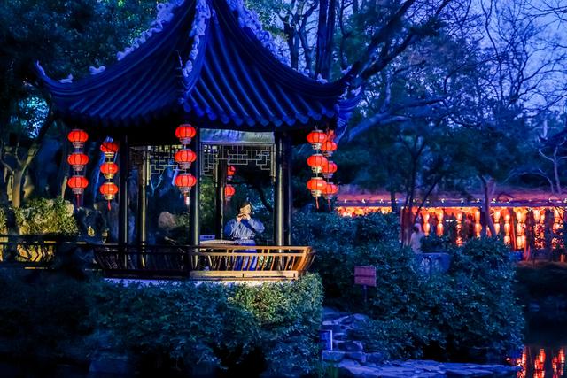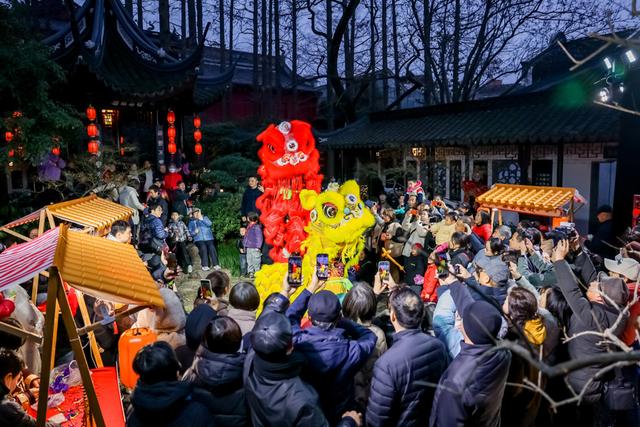 “凤箫声动,玉壶光转,一夜鱼龙舞。”提着花灯的小朋友吟诵着元宵节的古诗,迎接市民入园游玩,风雨廊内也已经有不少身着汉服的市民在拍照打卡。在接景廊,灯谜长龙曲折蜿蜒,小朋友们猜着灯谜欢声笑语;在水月亭,多彩造型灯光将园子里营造得优雅多姿;在镜心庐,群众在此纳福送福,送上新年美好祝愿;在迎曦亭、湖畔亭内,上演丝竹民乐;在紫藤廊,绚丽多姿的灯笼通道成为汉服仙女的打卡专属地;在石鼓亭,百戏精粹轮番上演,推动游园会进入高潮……丝竹雅乐与园林景致完美相融,让人沉浸式感受传统文化的魅力。