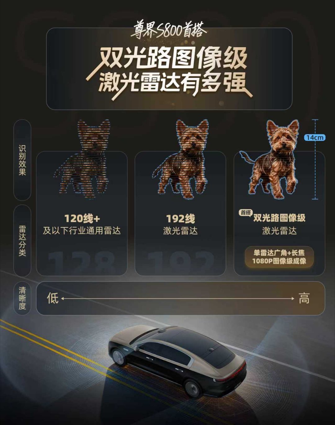 还别说,今天鸿蒙智行的发布会,真的被尊界S800给秀到了!全球首发的新一代双光路图像级激光雷达,无论是成像能力,还是感知能力提升都比较大,开起来更舒服、安心。另外是贴心功能,挥手关对侧车门,对于抱娃的乘员来说,这真的太方便了。不得不说,尊界这波操作,是真的稳了。华为新激光雷达可远距识别14cm物体华为新激光雷达成像分辨率提升4倍
