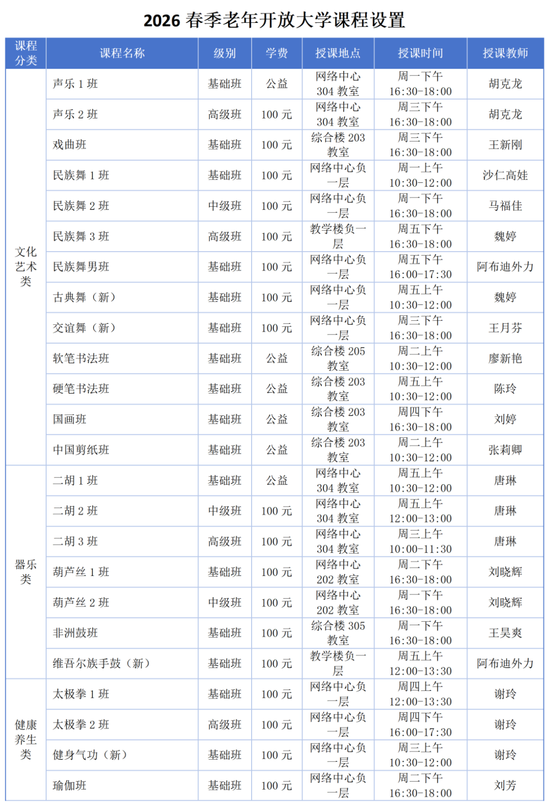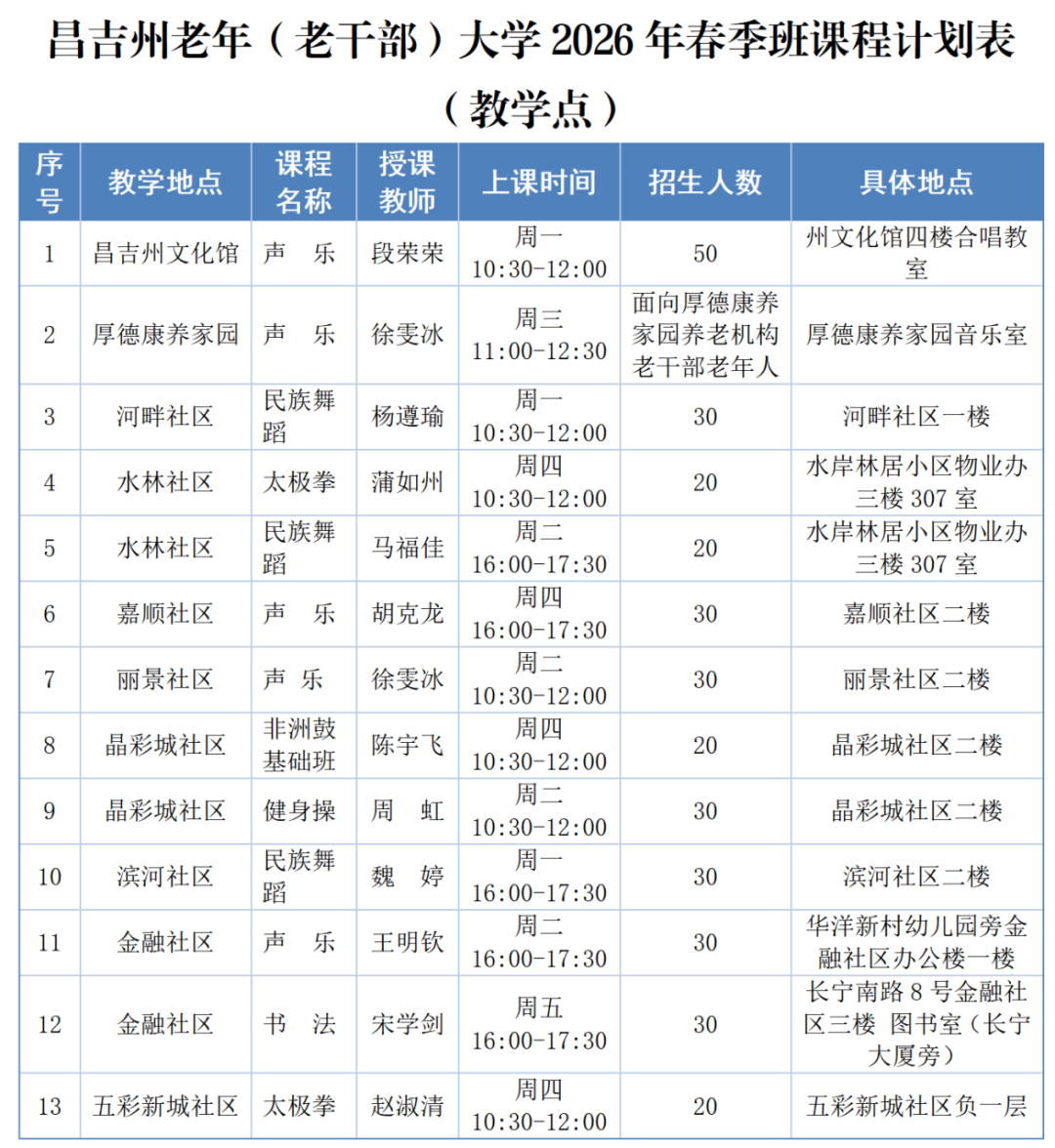 1.学员根据本人身体状况、学习基础、上课时间、授课教师、教学地点等慎重选报课程,详见《昌吉州老年(老干部)大学2026年春季班课程计划表》。