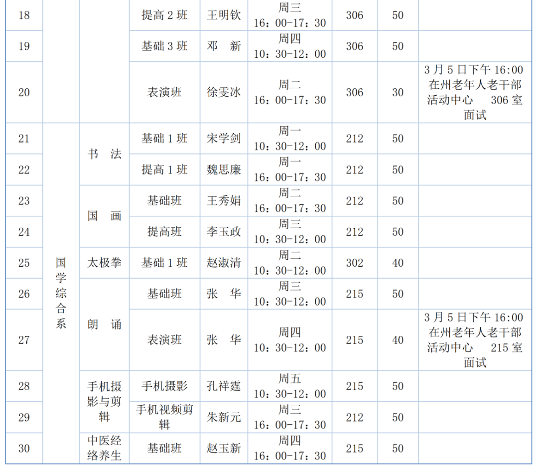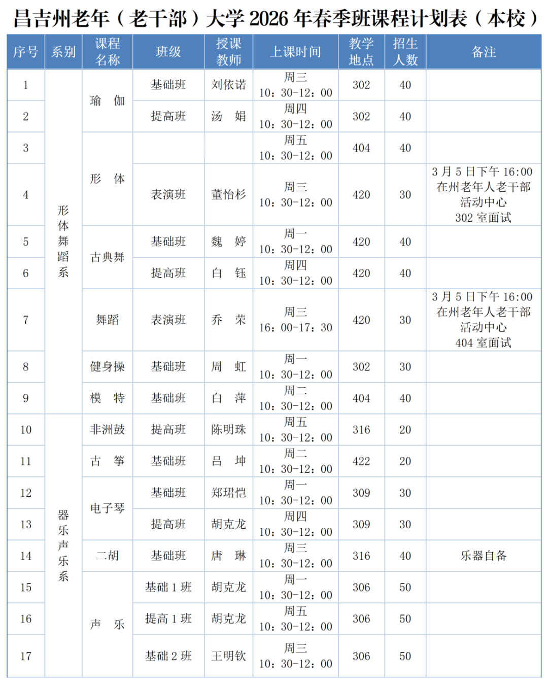 2.表演班课程须有一定表演基础及舞台经验,并经老师线下面试合格后方可报名上课,面试时间、地点详见《昌吉州老年(老干部)大学2026年春季班课程计划表》(本校)。