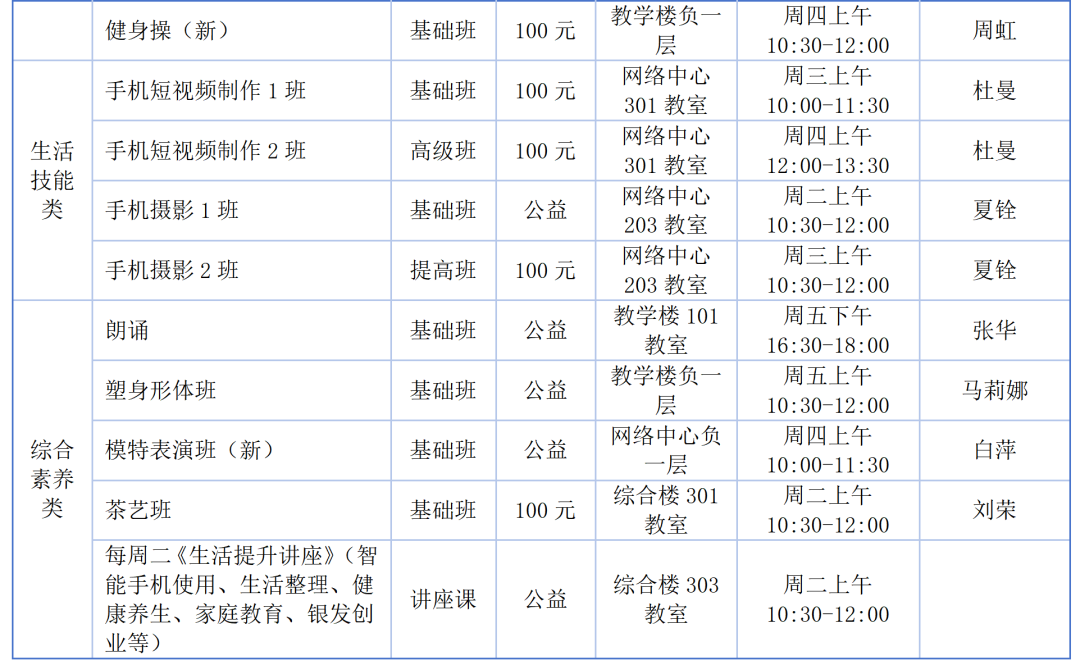 4.根据本人需求选择课程,每人公益类课程只限选报1门(除《周二生活提升讲座》外),收费类课程在时间不冲突的情况下不限门数,务必慎重考虑,量力而行。