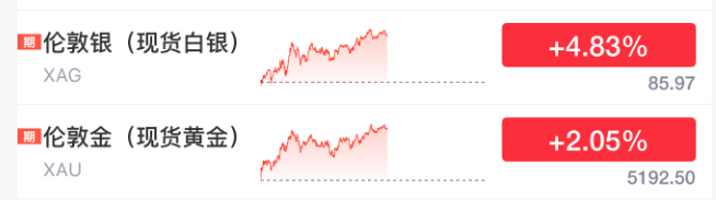 截至记者发稿时,现货黄金、白银的涨幅分别为2.01%、5.12%,价格分别报5190.9美元/盎司、86.2美元/盎司;COMEX黄金期货、白银期货价格分别上涨1.45%、2.99%,价格分别报5197.8美元/盎司、85.965美元/盎司。