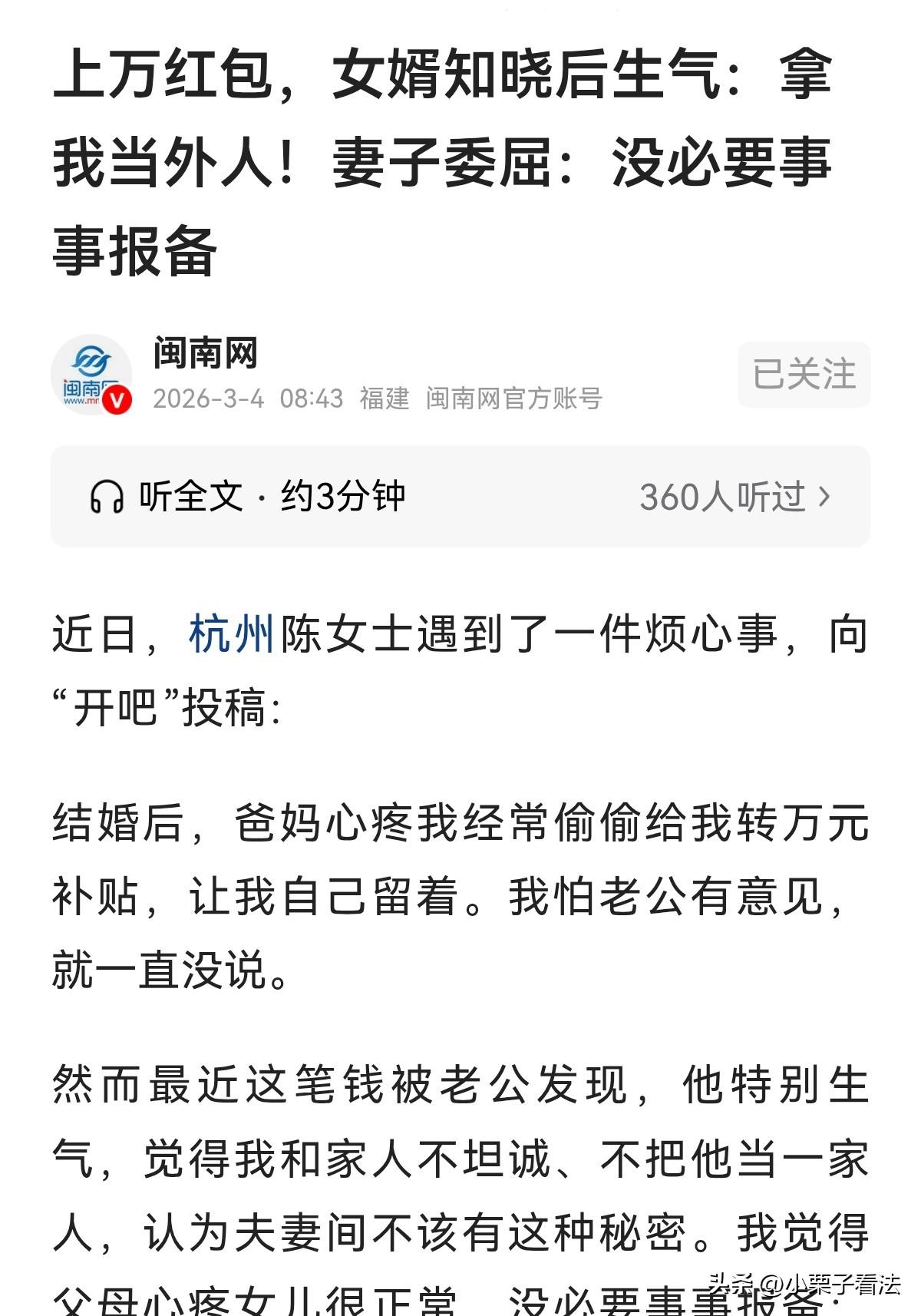 “有这样的岳父母还不偷着乐!闹哪出?”浙江杭州,女子与丈夫婚后在外地生活,父母牵挂她没钱花,怕她受委屈,偷偷给她转钱,每次都上万块,怕女婿有压力,让女子当做私房钱别很女婿说。谁知纸包不住火,女婿知道此事后大发雷霆,认为他们是一伙的,把他当成外人,不信任他,与女子大吵,女子很委屈,将此事发布网上,让大家评评理! 陈女士结婚后远在外地生活,父母心疼她,悄悄给了她一笔钱,可这件事被丈夫发现后,却引发了两人结婚以来最激烈的争吵,也让她对婚姻里的坦诚与隐私,有了新的思考。 陈女士和丈夫在杭州组建了小家庭,两人勤恳工作,日子过得平稳踏实,虽没有大富大贵,却也温馨和睦。 可在陈女士父母心中,女儿独自在外生活,始终是他们的牵挂。 老两口总担心女儿手头拮据、在外受委屈,又怕直接给女儿钱,会让女婿觉得没面子,伤了他的自尊心,觉得岳父母不信任他的养家能力。 反复思量后,父母选择偷偷给陈女士转钱,每次金额都有上万元。 转完账后,父母还再三嘱咐女儿,让她把钱收好当作私房钱,不要告诉丈夫,避免引起不必要的误会和压力。 陈女士也认同父母的想法,在她看来,这是娘家给自己的疼爱和底气,属于自己的私人心意,没必要事事向丈夫报备。 说出来反而可能让丈夫多想,于是便一直将这笔钱悄悄存着,从未向丈夫提及。 可隐瞒终究难以长久,一次偶然的机会,丈夫无意间看到了陈女士手机里的转账记录。 得知岳父母多次偷偷给妻子转钱,每次都是上万元,而自己对此一无所知,瞬间怒火中烧。 他无法接受妻子和岳父母的刻意隐瞒,认为夫妻之间本该毫无保留、坦诚相待,如此大额的资金往来,却联合起来瞒着他。 他们就是把自己当成外人,是对他的不信任,更是看不起他无法撑起这个家。 积压的情绪彻底爆发,两人为此大吵一架,家里的气氛降到了冰点。 陈女士满心委屈,她觉得自己和父母都没有恶意,父母的补贴纯粹是出于疼爱,没有针对丈夫的意思。 隐瞒也只是想避免矛盾,可在丈夫眼里,却成了不尊重、不坦诚。 一边是心疼自己的父母,一边是共度余生的丈夫,她夹在中间左右为难,不知该如何化解这场僵局。 万般无奈下,陈女士将自己的经历发到网上,希望网友能给自己评评理。 此事很快引发了热议,大家的观点各不相同。 有人理解陈女士和父母的做法,认为长辈补贴子女是人之常情,属于私人的亲情表达,不必事事告知配偶。 其实就是女婿自卑心在发作,这不是信任不信任的问题,这是人家与女儿之间的感情联络及爱护!不必要吃醋,更不能生气! 也有人支持丈夫的想法,觉得婚姻里大额经济往来应该透明,刻意隐瞒只会伤害夫妻间的信任。 还有人认为,双方都没有坏心思,只是缺乏沟通,才让一份关爱变成了一场矛盾。 有人说如果是我就装作不知道,其一毕竟老人给钱帮助是好事,感谢都还来不及呢!其二要知恩图报,以后多给老人些关爱和帮助。不能给钱给出仇了啊!这男的太小心眼! 其实这件事本就没有绝对的对错,父母的出发点是满满的关爱,只想让女儿过得轻松一些。 丈夫生气的根源,是渴望被尊重、被信任,不想在婚姻里被蒙在鼓里。而陈女士,只是想守护父母的心意,同时不想让丈夫难堪。 这场风波也戳中了很多婚姻里的现实问题,夫妻间需要坦诚,却也需要适度的隐私和边界,绝对的透明未必能换来长久的感情。 亲情与爱情的平衡,坦诚与隐私的尺度,从来都需要用心经营。 很多时候,家人之间的矛盾,并非源于恶意,而是缺少换位思考和有效沟通。 少一点敏感猜忌,多一点理解包容,才能让家庭关系更加和睦,也能让这份藏在钱里的关爱,不变成伤害感情的利器。 您觉得妻子该不该将父母给钱的事告诉丈夫呢?