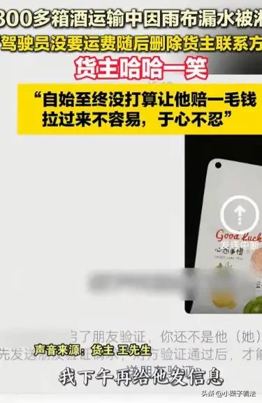 “这是怕找后账!”安徽宿州。男子需要运送345箱酒,便在某平台联系了一辆货车,运费是340元。谁知运输途中遇下雨,到货后发现,因雨布破损漏水,345箱酒有300箱被淋湿。司机一看傻眼了,直接说运费不要了,你就看着弄吧!然后开车就跑了!男子觉得司机耗油熬半夜赚点钱不容易,于心不忍,就给司机发信息协商。万没想到,司机将他微信拉黑电话删除,联系不上了。男子无奈笑了笑:我至始至终没打算让他赔一分钱,将包装纸拆开散卖,便宜点就行了!至于的吗? 王先生做酒水生意,前不久需要运送345箱酒,便在某平台找了一位货车,运费为340元。 装好货物,司机便开车上路,王先生本以为就是一次普通的运输,没成想,一场雨,彻底打乱了一切。 运输途中突降大雨,偏偏车上的雨布是破了洞的,雨水顺着缝隙灌进车厢,把整箱整箱的酒泡在了水里。 等货车抵达目的地,王先生满心欢喜地去掀雨布卸货,眼前的景象让他当场傻眼了。 345箱酒,至少300箱全都被雨水淋透,原本精致规整的酒盒,被泡得软塌变形,表面全是深浅不一的水渍,有的甚至边角发皱、图案模糊,看上去就像刚从水里捞出来一样。 粗略一算,这批酒的包装损毁严重,直接影响销售,损失可不是小数目。 王先生心里又心疼又无奈,换做谁看着好好的货物变成这样,都难免上火。 一旁的司机见状,脸瞬间白了,眼神里满是慌张和愧疚。 他心里清楚,是自己没做好防护,雨布破损没及时发现,才酿成这样的后果。 面对眼前的损失,司机越想越害怕,他知道这批酒价值不低,自己根本赔不起。 支支吾吾半天,司机憋出一句话:老板,我这340块运费不要了,你看着咋弄吧! 不等王先生回应,司机像是逃一样,转身上车发动车子,匆匆离开了现场。 王先生没顾着管司机,先把淋湿的酒箱搬进库房,用吹风机吹干,尽量挽救减少损失。 他想着等清点完货物,再跟司机好好沟通,毕竟他也是宿州本地的。 可让王先生没想到的是,等他下午整理好货物,拿出手机想给司机发消息协商时,发现微信拉黑,电话删除了! 那一刻,王先生先是一愣,随即无奈地哈哈一笑:至于的吗? 他心里明白,司机是怕他索赔,干脆用拉黑删除的方式一躲了之。 明明自己占理,明明可以要求赔偿,却被对方当成了要追责的“恶人”,这份误解,让王先生觉得又好笑又唏嘘。 面对旁人的不解,王先生坦然地说出了自己的想法。 他说,司机一趟运费才340块钱,自己怎么可能第一时间就想出孬点子,让他赔几万块的损失,去讹他呢! 这根本不现实,也不是他做事的风格。司机跑运输风里来雨里去,熬五更爬半夜的,还耗油费力的,就为了挣点辛苦钱,要是因为这点事逼对方赔偿,他实在于心不忍。 至于被淋湿的300箱酒,王先生也没放在心上。 他说,包装坏了没关系,严重的就拆箱散卖,实在不行便宜处理,总能卖出去,没必要揪着损失不放。 这件事传到网上,立刻引发了网友的热议。 大家纷纷指责司机格局太小,货物损毁是事实,即便害怕赔偿,也不该逃避责任,主动沟通或许还能得到谅解,拉黑删除的做法,不仅丢了诚信,也彻底丢掉了后续合作的可能。 《民法典》第832条规定:承运人对运输过程中货物的毁损、灭失承担赔偿责任。 王先生与司机成立货物运输合同,司机有义务将货物安全运达, 300箱酒淋湿,发生在运输途中,且因雨布破损漏水所致。 《民法典》第180条:因不可抗力不能履行民事义务的,不承担民事责任。不可抗力是不能预见、不能避免且不能克服的客观情况 。 普通降雨属于可预见、可避免、可克服的常规天气,司机可提前查天气预报、妥善覆盖、检查雨布、必要时停车避雨。降雨不构成不可抗力,司机不能以此免责。 《民法典》第590条:当事人一方因不可抗力不能履行合同的,根据不可抗力的影响,部分或者全部免除责任;迟延履行后发生不可抗力的,不免除责任。 放弃340元运费,属于司机单方行为,不等于王先生放弃索赔权。 拉黑删除、逃避沟通,不改变责任归属,反而属于消极逃避责任,不能免除赔偿义务。 王先生自愿不索赔,是放弃债权处分,不等于司机无责。 但王先生没有拿着道理咄咄逼人,反而选择了体谅与宽容。 他算的不是经济账,而是人心账,懂得普通人挣钱的不易,宁愿自己承担损失,也不愿为难一个辛苦谋生的司机。 生活里,总有人遇事就躲,怕担责、怕吃亏,可往往是越躲,路越窄。 而像王先生这样的人,得理也饶人,用厚道化解矛盾,用大度包容他人,才是真正的格局。 真正的大气,从不是腰缠万贯,而是身处道理一方,却愿意给别人留一条活路。 对此您怎么看?