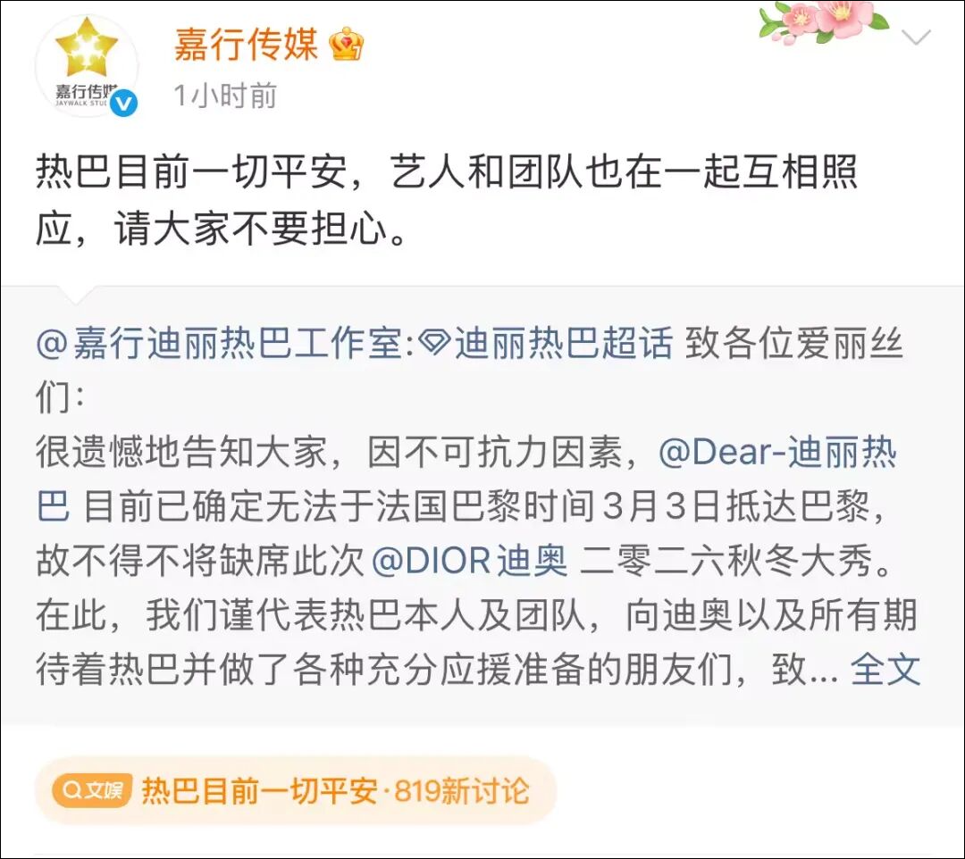 3月3日,@嘉行迪丽热巴工作室发文称,因不可抗力因素,@Dear-迪丽热巴目前已确定无法于法国巴黎时间3月3日抵达巴黎,将缺席时装周。工作室称热巴目前一切平安,艺人和团队也在一起互相照应,请大家不要担心。