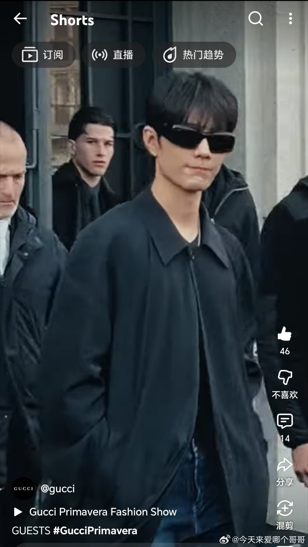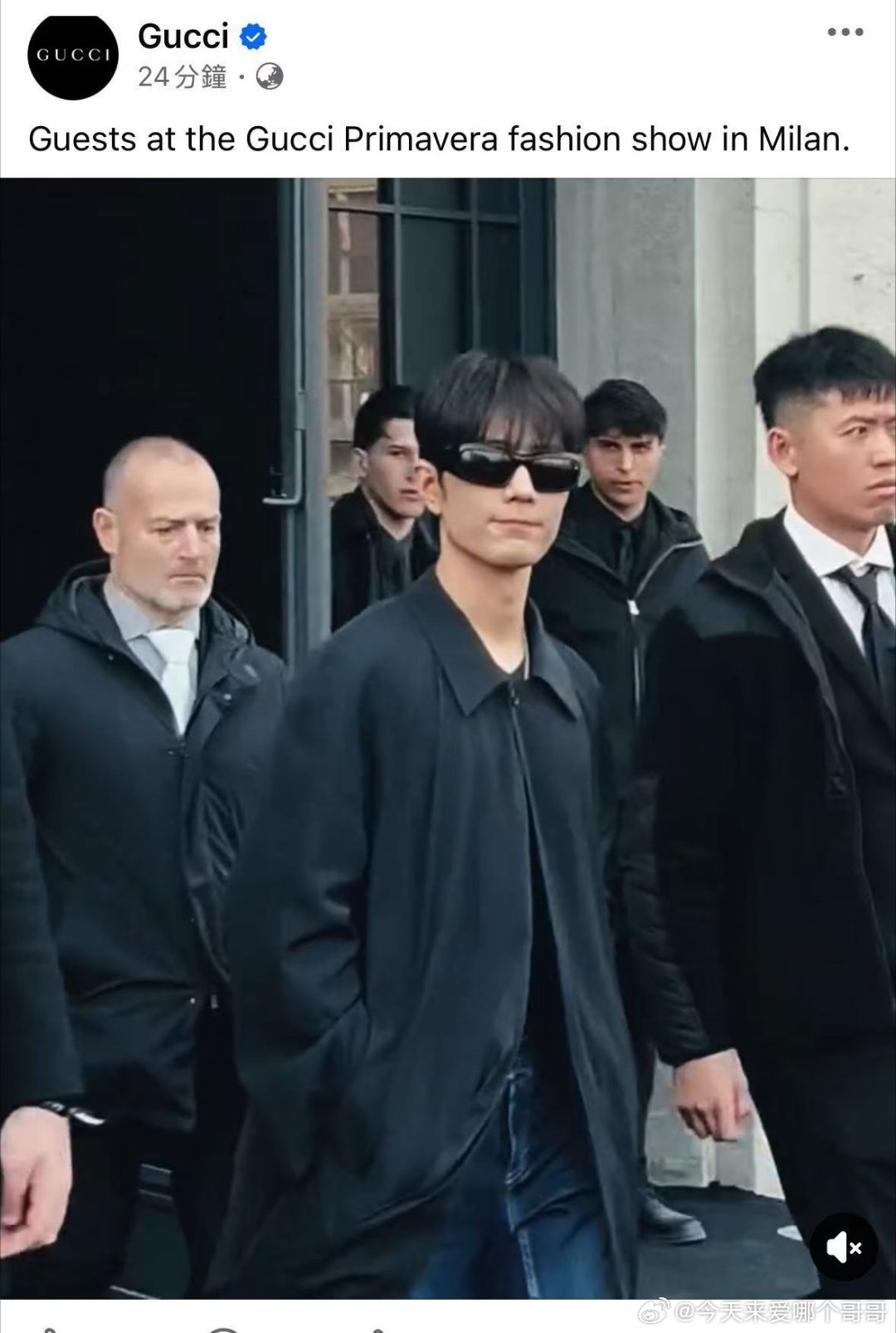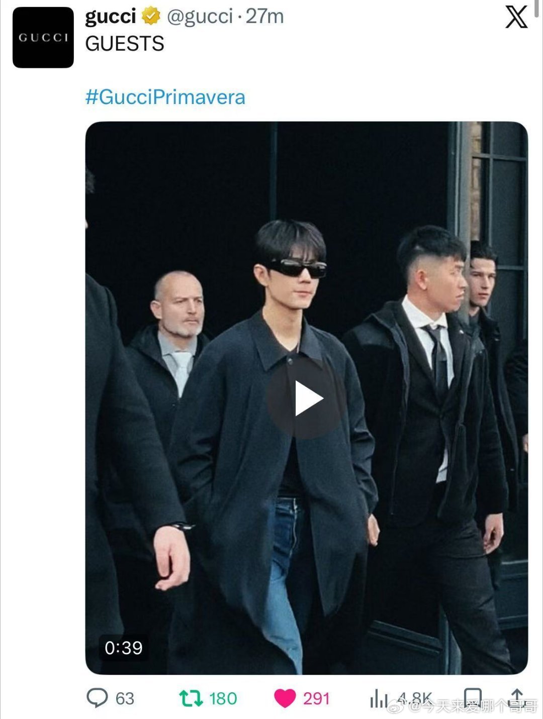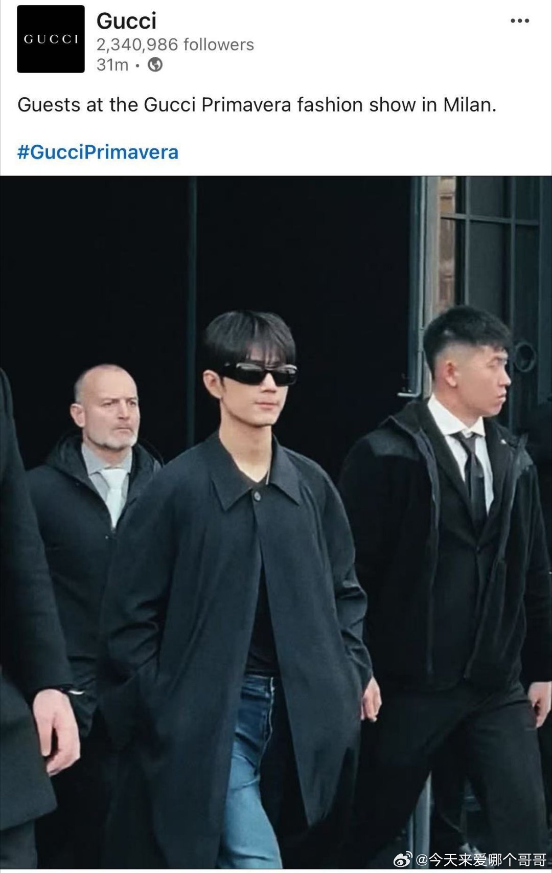 Gucci官方 IG、FB、X、threads、LinkedIn、YouTube shorts更新秀场明星入场合集~肖战作为全球品牌代言人均在视频首位出现,老古就这样给足排面