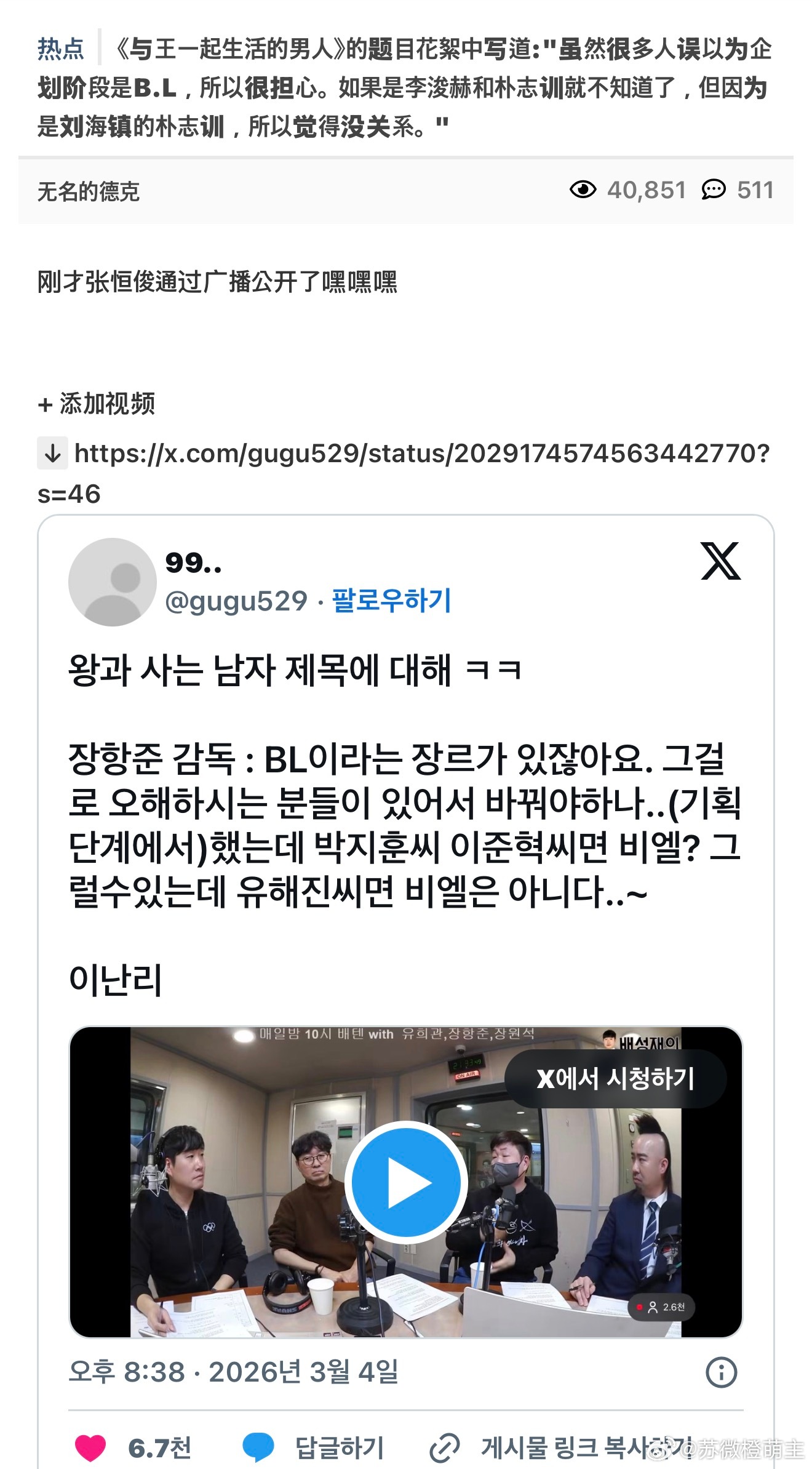 笑疯了我导演在广播里cue这个了哈哈哈哈哈【热帖】与王同住的男人今天的广播张恒俊导演:有一种类型叫BL。因为担心有些人会误以为企划阶段是BL,所以很担心。但如果是朴志训和李浚赫的话,会是BL吗?有可能…但如果是柳海镇和朴志训的话,就没关系了评论区都是:ㅋㅋㅋㅋㅋㅋㅋㅋㅋㅋㅋㅋㅋㅋ