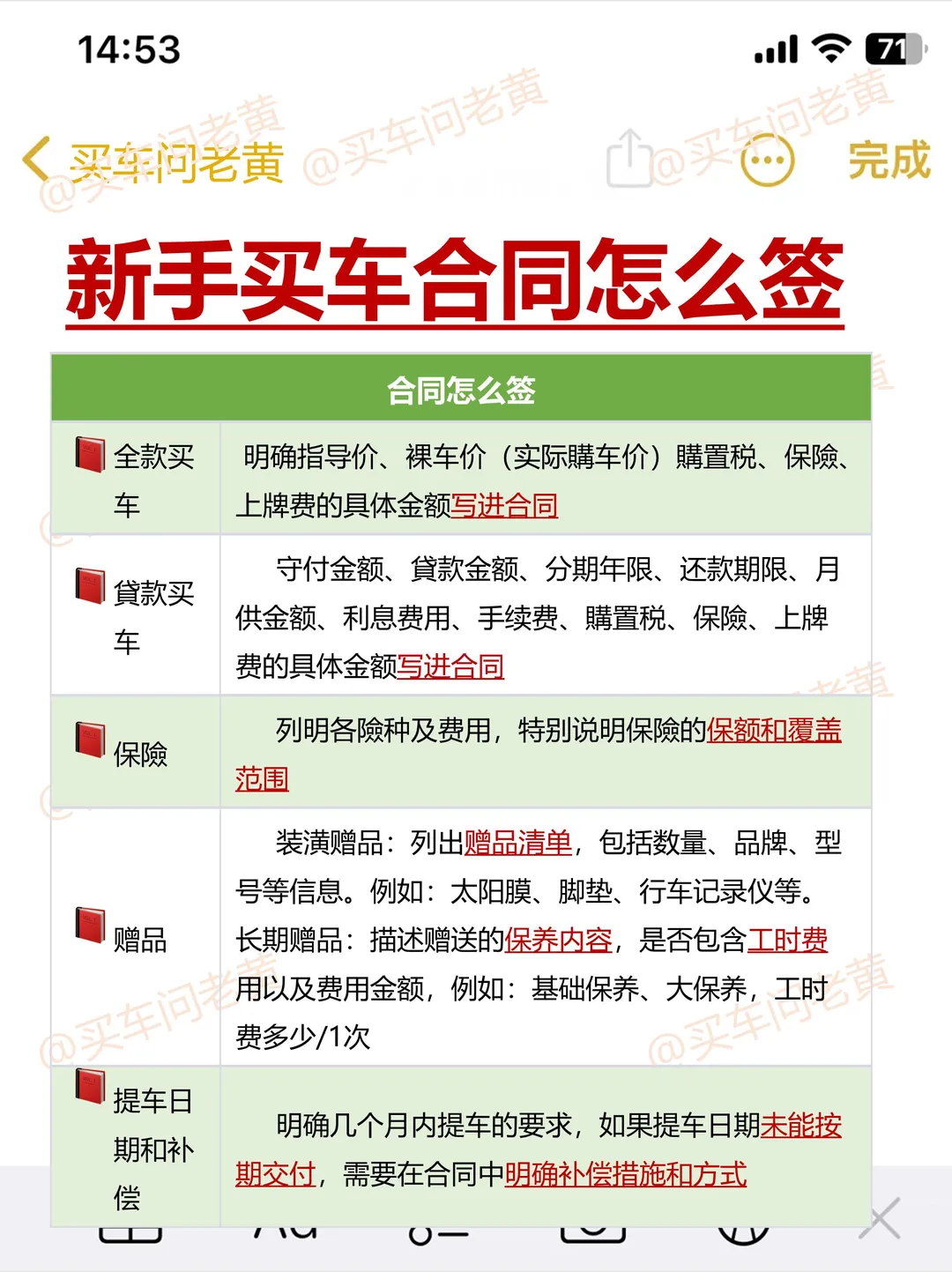 所有费用明细、车型配置、颜色、赠品全都写进去。提车日期必须写明,超时怎么处理也得约定好。别信口头承诺,白纸黑字最保险!