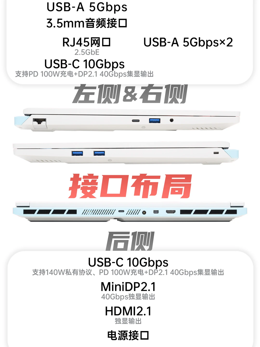机械革命 蛟龙16 Pro 潮玩版最大的特点是配色,外壳用白色,LOGO和尾部用浅蓝色点缀,很“文气”,不像其他型号那么粗犷。