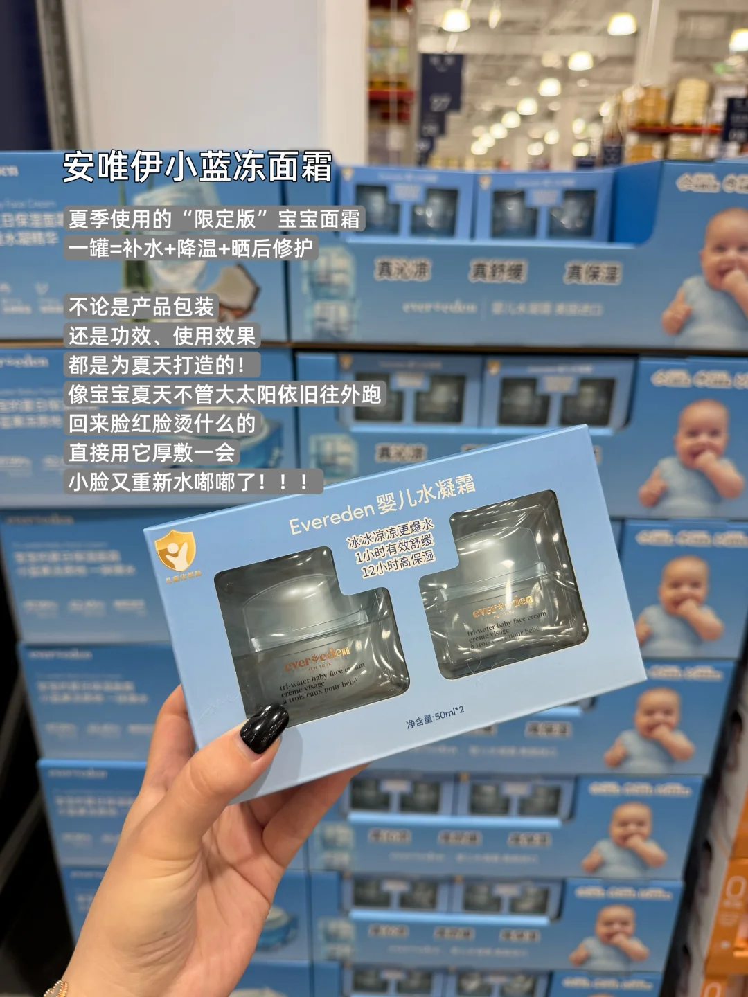 • 安唯伊小蓝冻面霜:适合夏季用的婴儿面霜。一罐补水保湿、晒后舒缓降温都ok。质地也很夏天,一抹化水超清爽,上脸凉丝丝。山姆最近新上了套装,189.9元2罐,特别的划算。